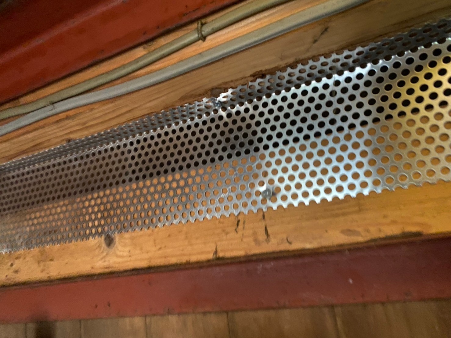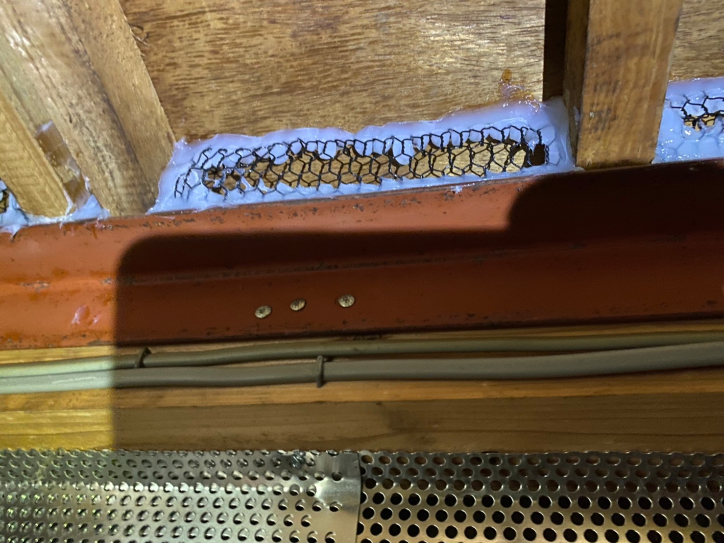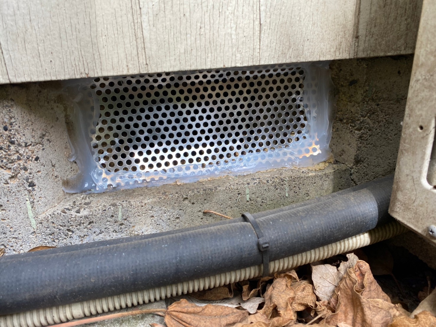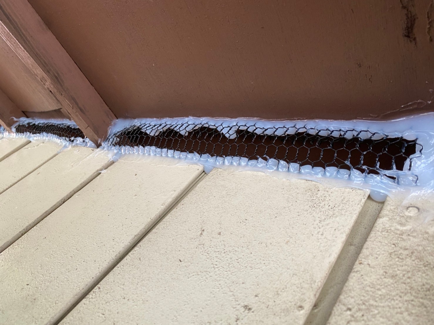 続いて、ネズミ、アライグマの再侵入を防ぐために、パンチングメタルや金網、コーキング剤などを用いて侵入経路の封鎖を行います。