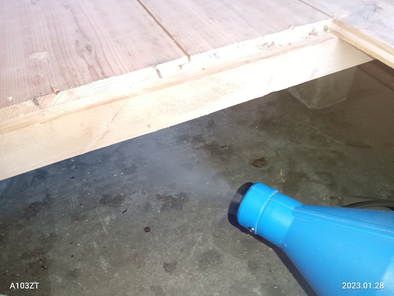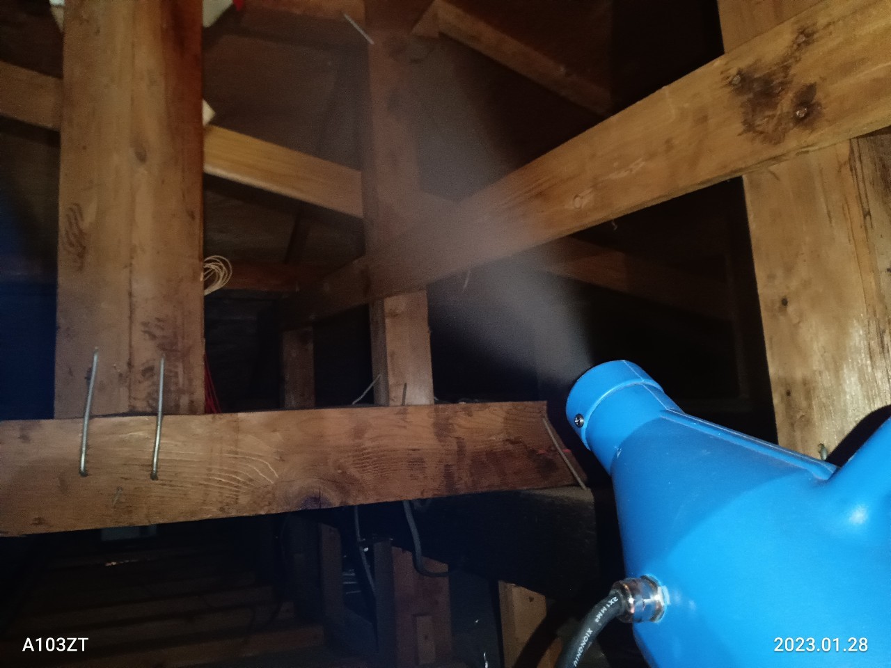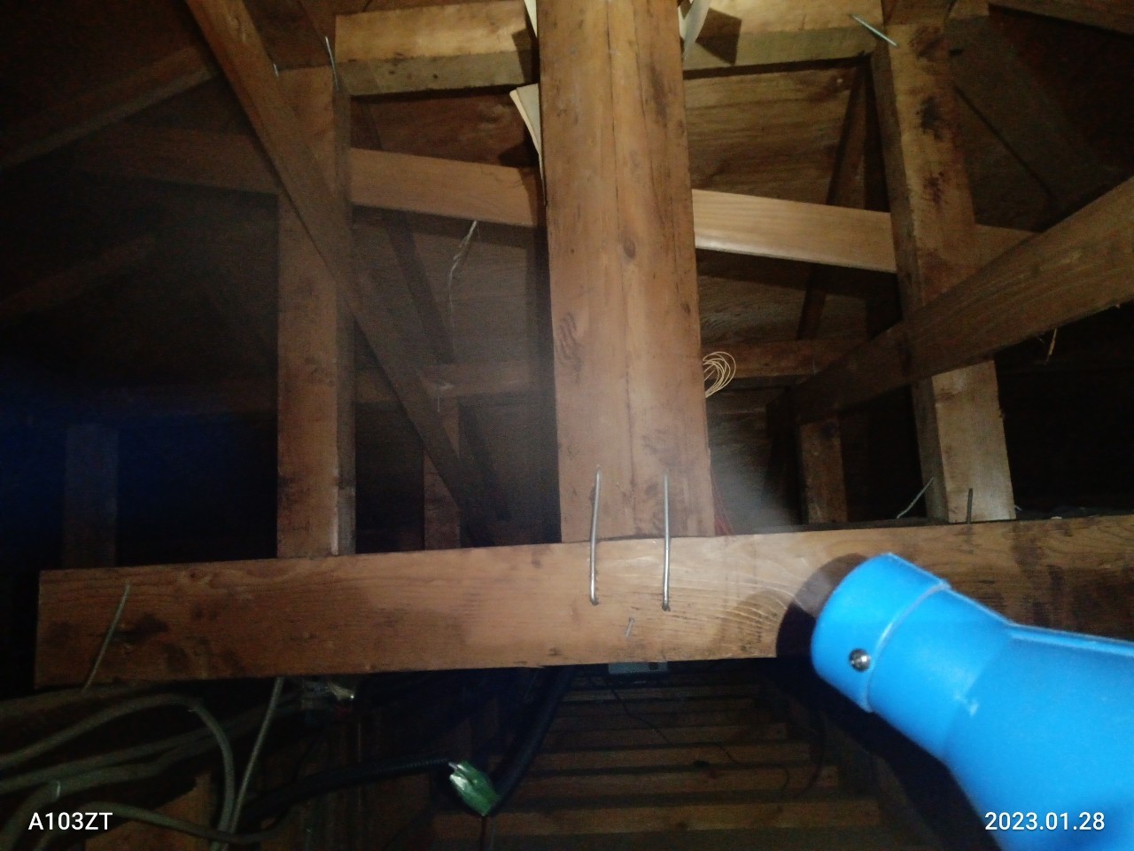 まずは、ネズミの巣がある場所に点検口を作成し、燻煙剤を使って屋内に潜んでいる個体を追い出します。