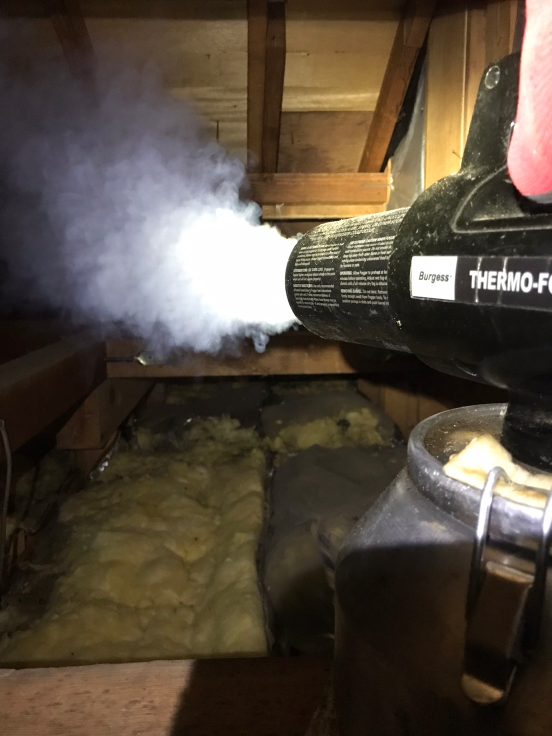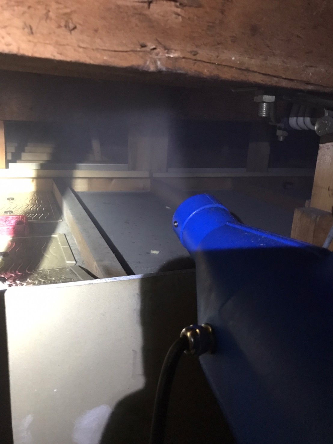 作業の初めに、ネズミの糞清掃や様々な作業を徹底して行えるように点検口を作成し、燻煙剤と呼ばれる薬剤を天井裏や床下に投入することで、ネズミを追い出していきます。
