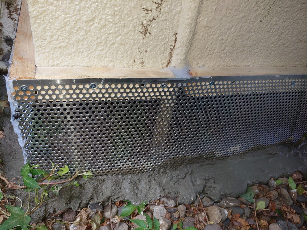 続いて、ネズミの再侵入を防ぐために、パンチングメタルや金網、コーキング剤などを用いて侵入経路の封鎖を行います。