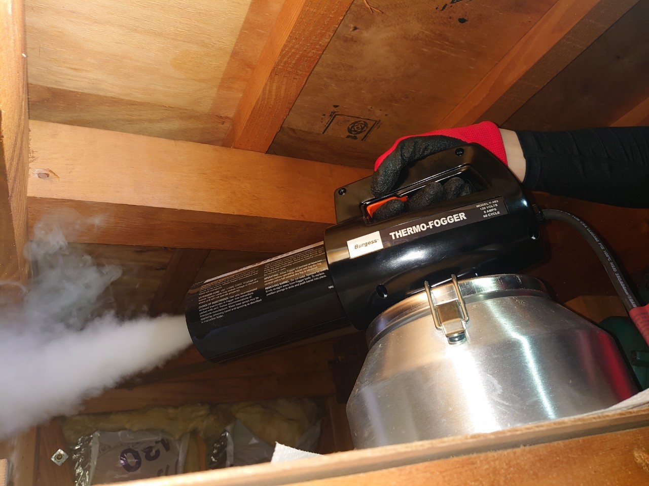 まずは、燻煙剤と呼ばれる薬剤を天井裏や床下に投入することで、コウモリを追い出していきます。