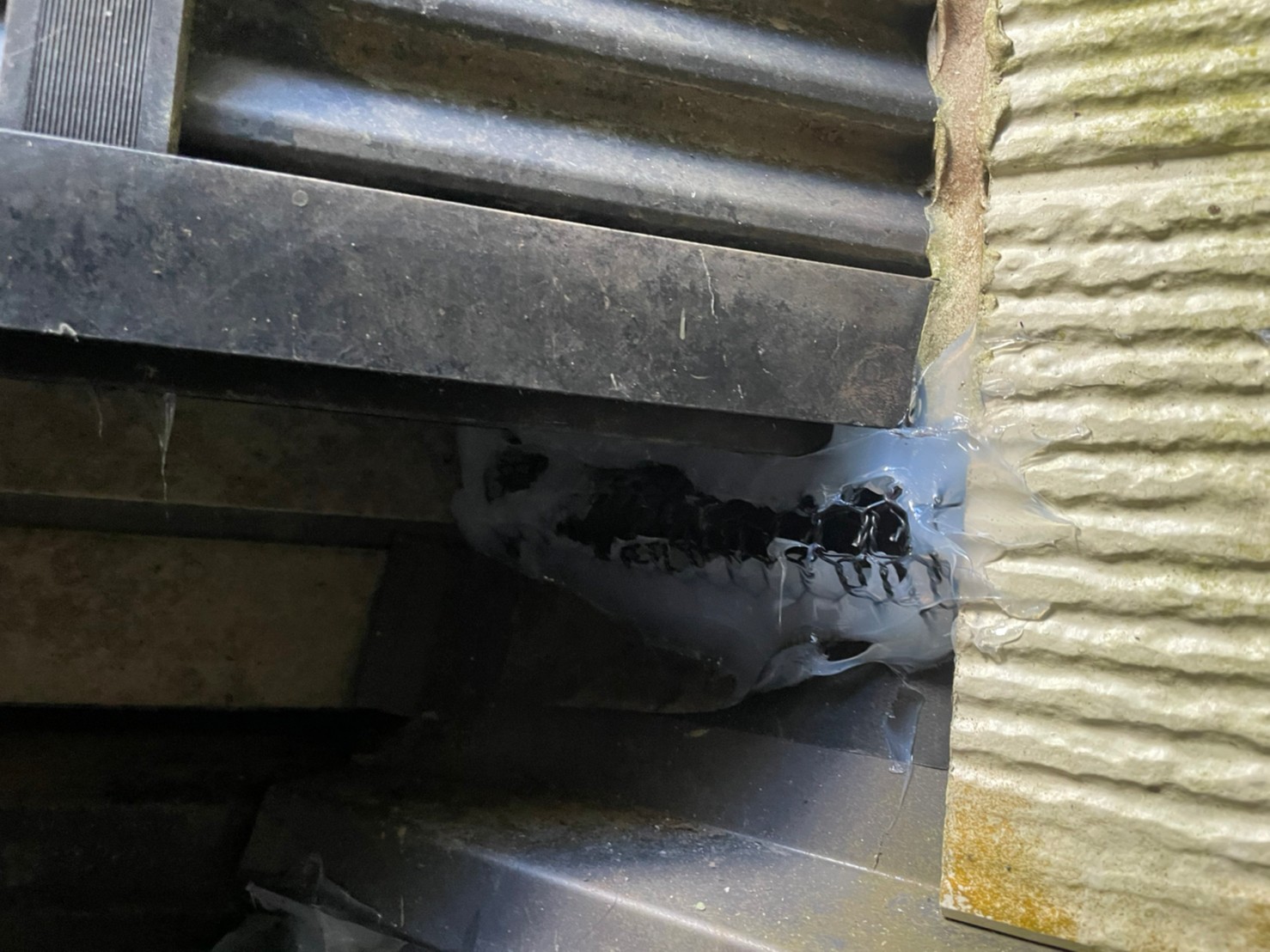 続いて、アライグマの再侵入を防ぐために、パンチングメタルや金網、コーキング剤などを用いて侵入経路の封鎖を行います。