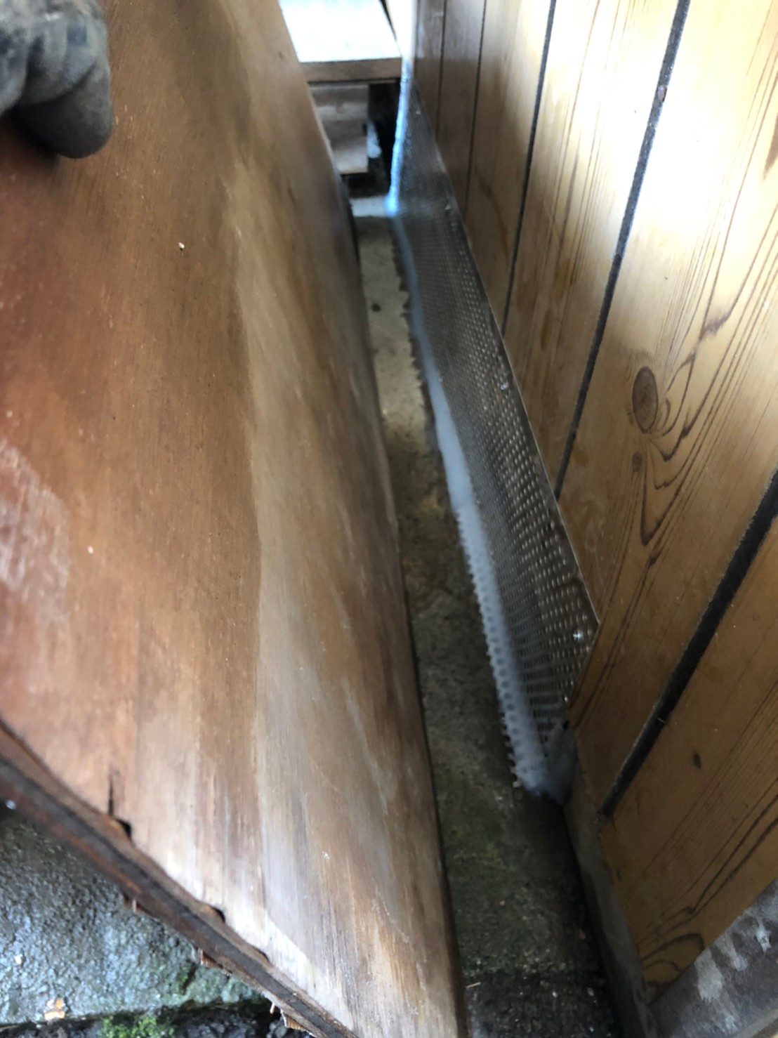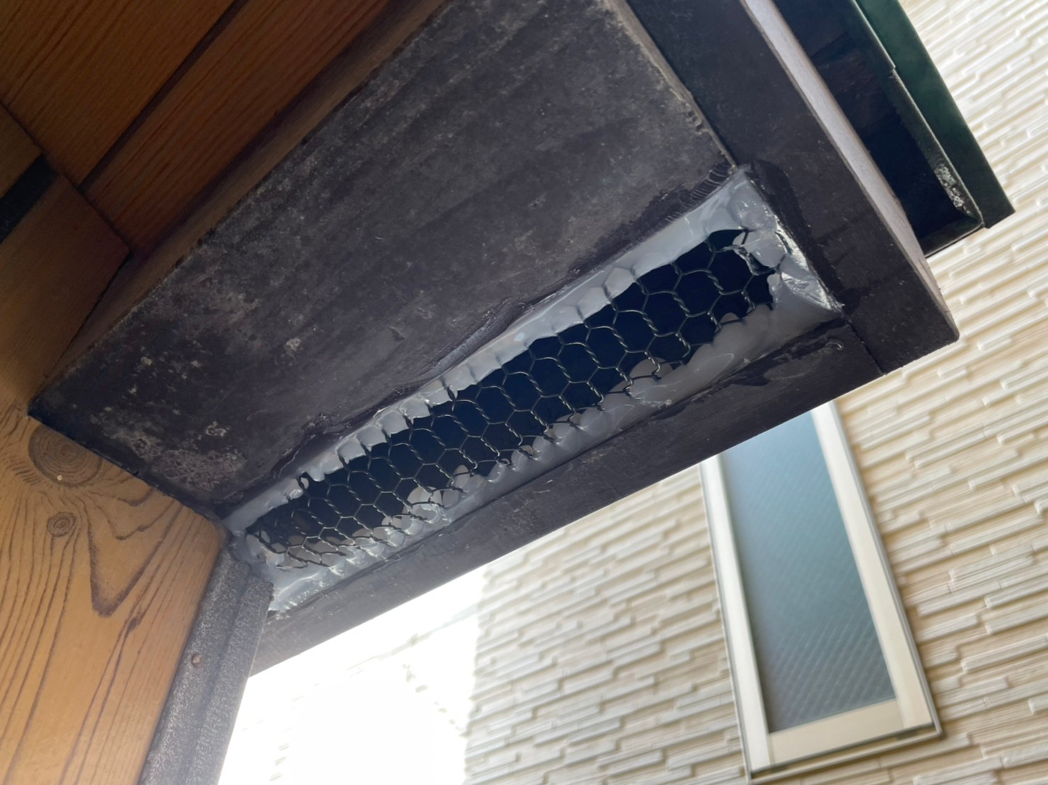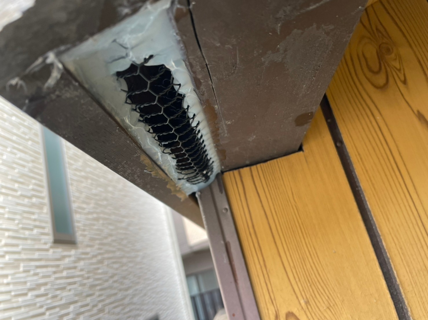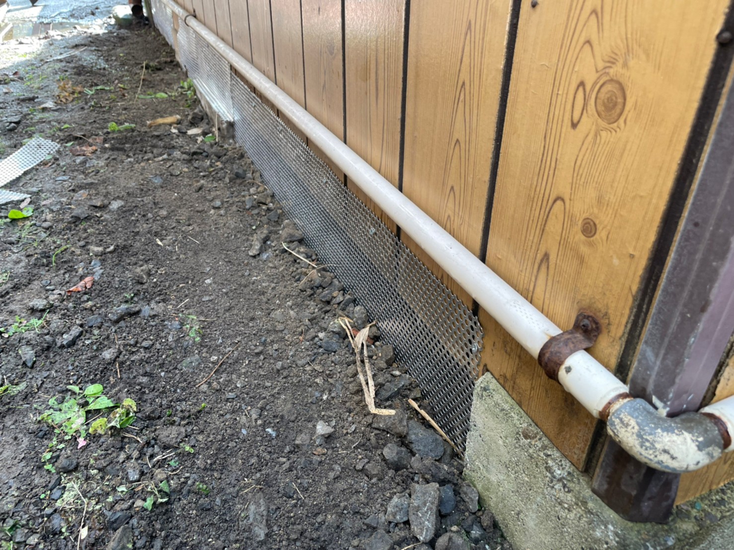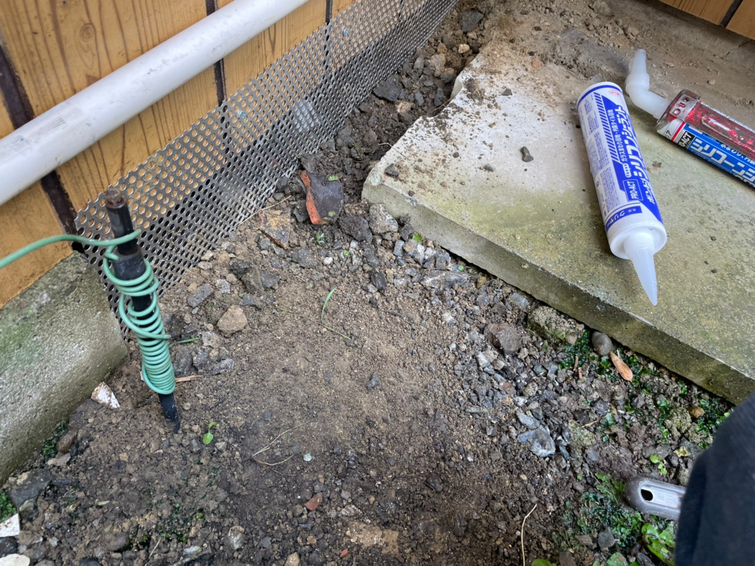 続いて、パンチングメタルや金網、コーキング剤などを用いて、あらゆる侵入経路を封鎖していきます。これによりハクビシン、アライグマに限らず、他の害獣の再侵入も防ぐことができます。