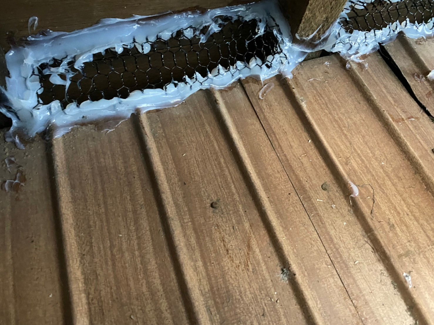 続いて、パンチングメタルや金網、コーキング剤などを用いて、あらゆる侵入経路を封鎖していきます。これによりネズミに限らず、他の害獣の再侵入も防ぐことができます。