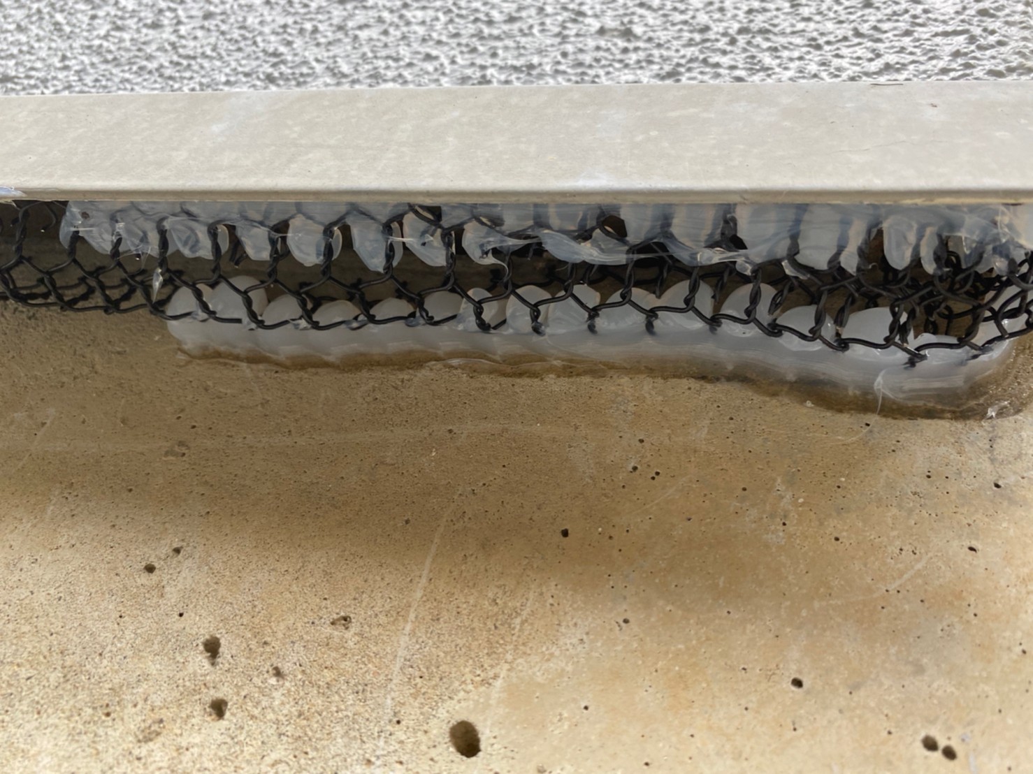 続いて、ネズミの再侵入を防ぐために、パンチングメタルや金網、コーキング剤などを用いて侵入経路の封鎖を行います。