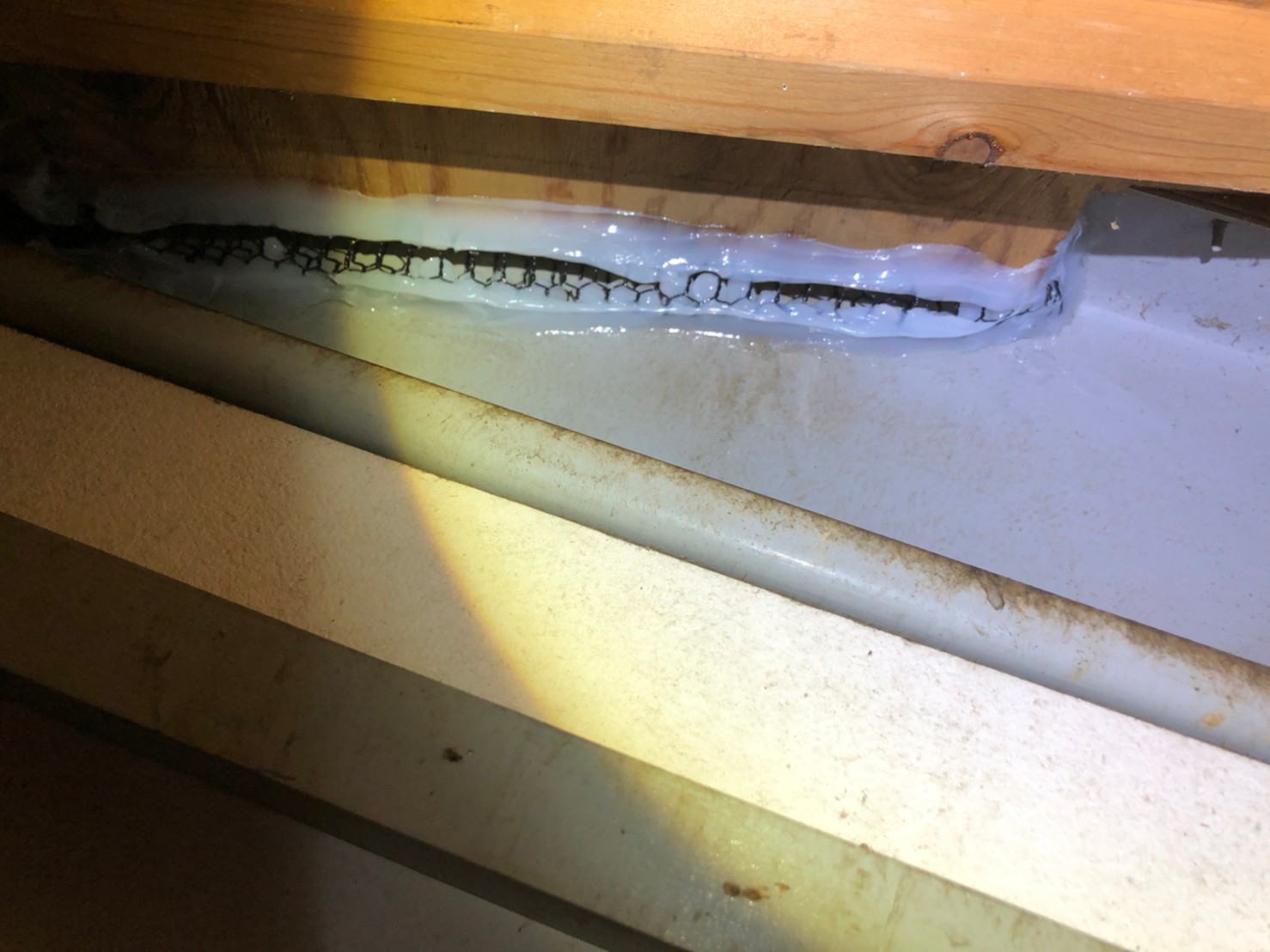 続いて、パンチングメタルや金網、コーキング剤などを用いて、あらゆる侵入経路を封鎖していきます。これによりネズミに限らず、他の害獣の再侵入も防ぐことができます。