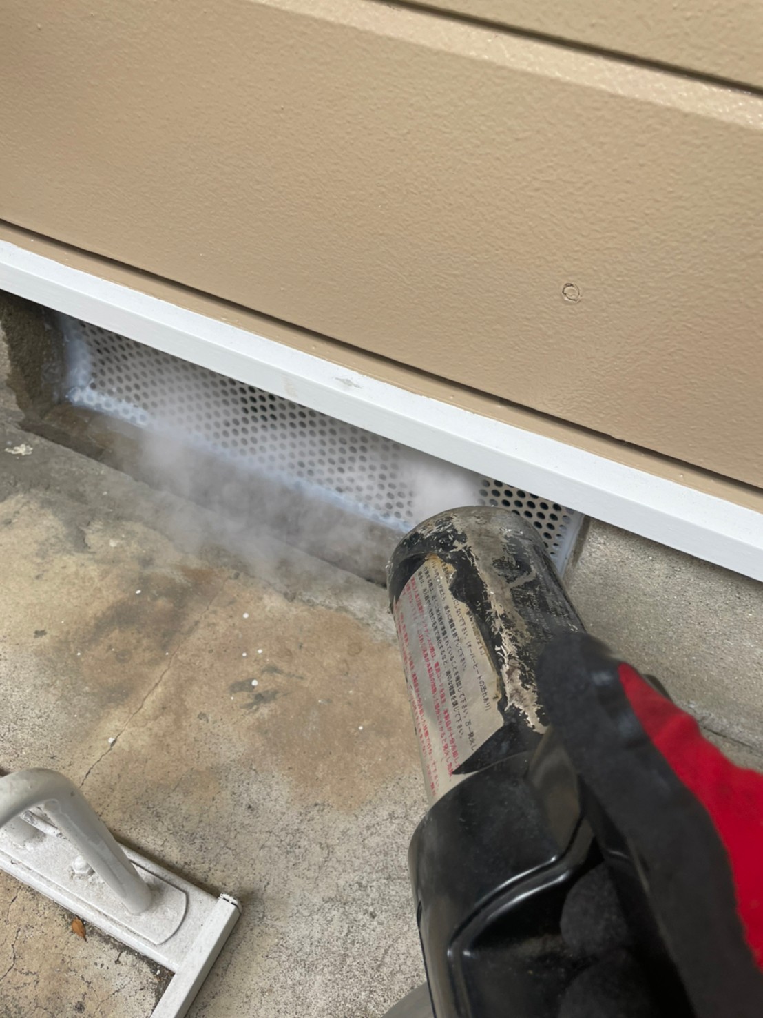通気孔はネズミの歯でも噛みちぎられず、ほかのアライグマなどの力持ちで器用な害獣にも対応している頑丈なパンチングメタルで補強し、隙間をコーキング材で封鎖いたしました。追い出し作業で忌避剤を噴射し、清掃と除菌剤を噴射することで、ネズミを寄せ付けず、ノミ・ダニをはじめとする病原菌も一緒に殺菌しています。