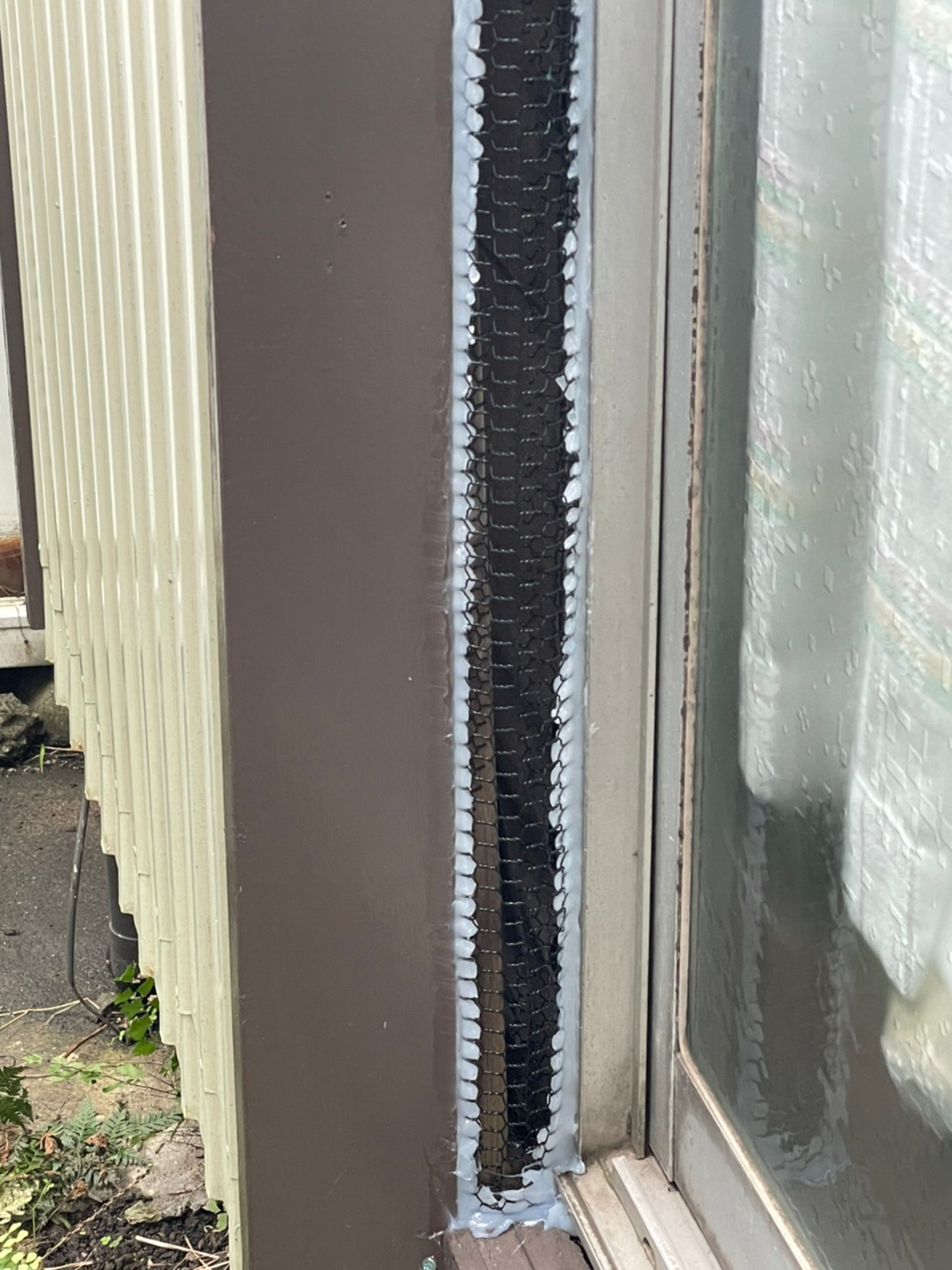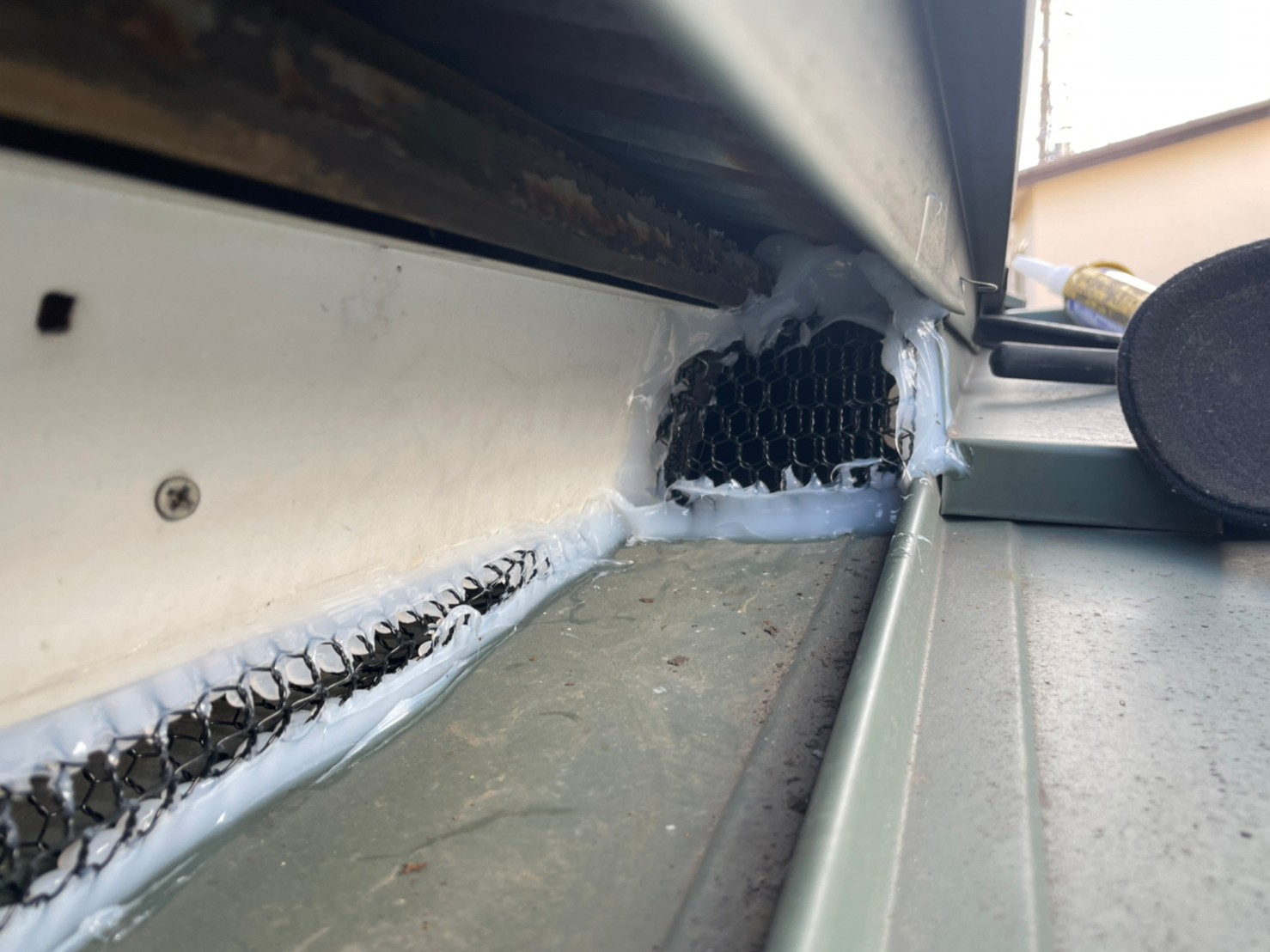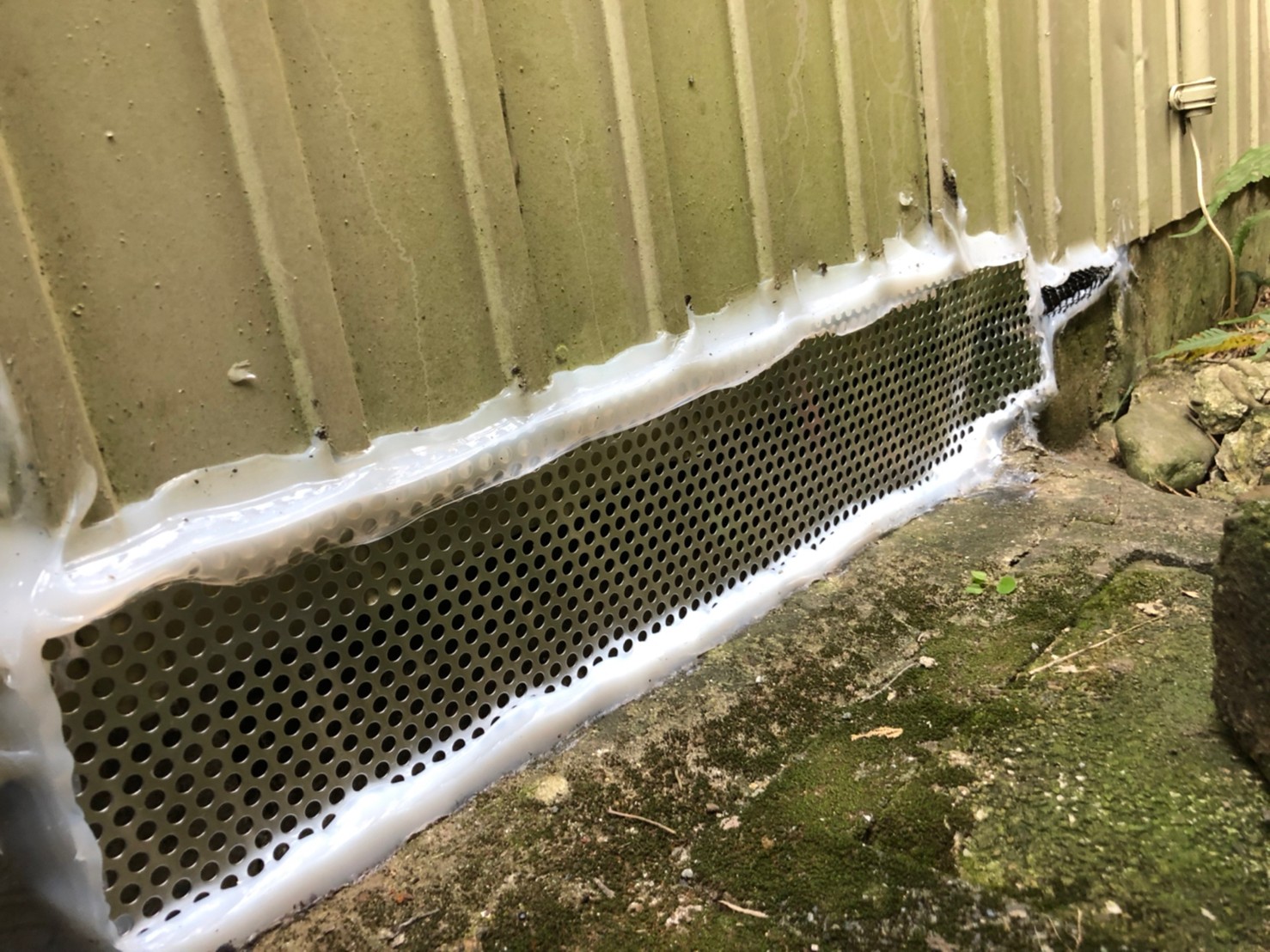 続いて、ネズミの再侵入を防ぐために、パンチングメタルや金網、コーキング剤などを用いて侵入経路の封鎖を行います。