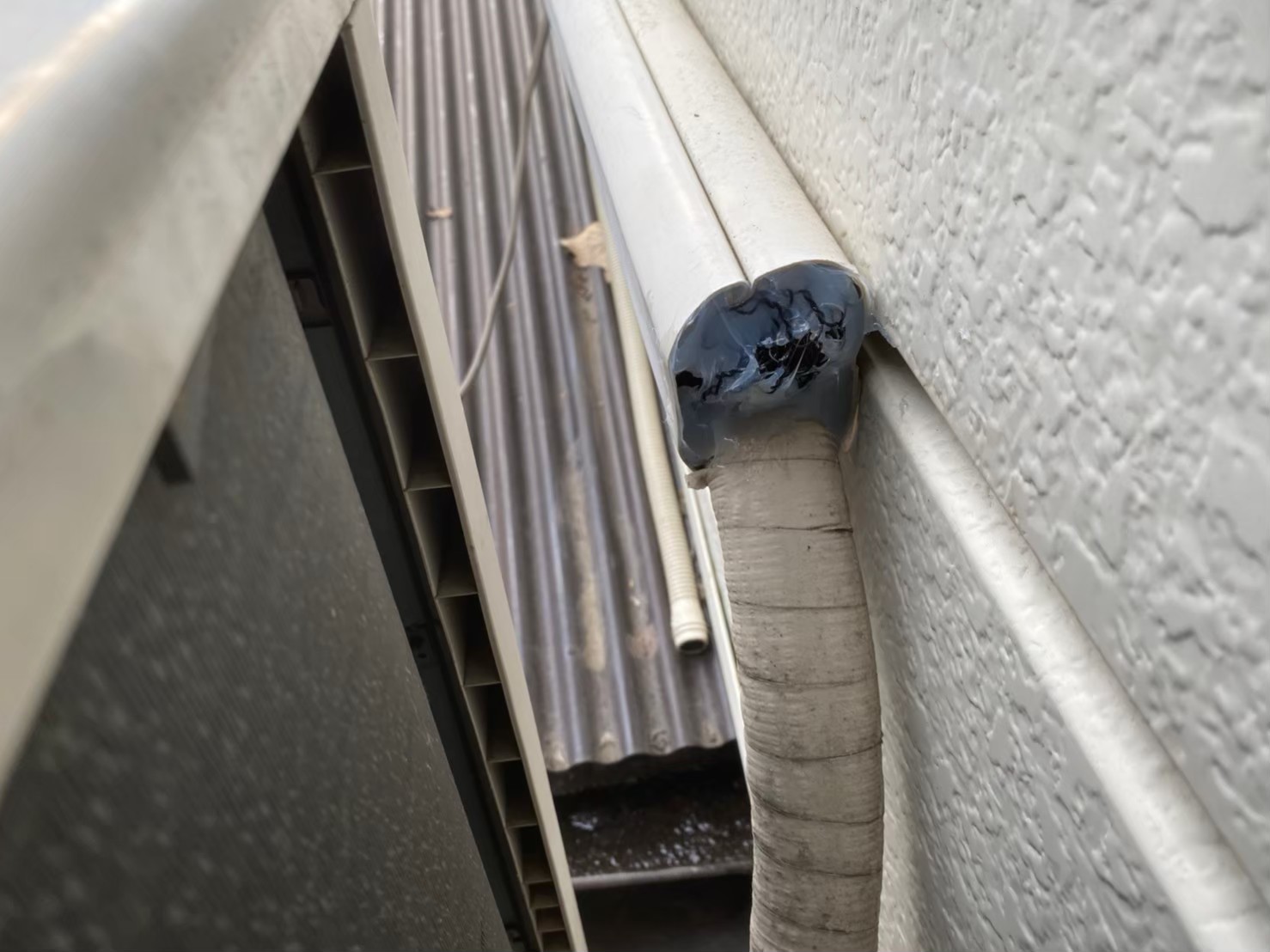 軒天の隙間や外壁の隙間、エアコン配管の隙間等がネズミの侵入経路と疑われました。