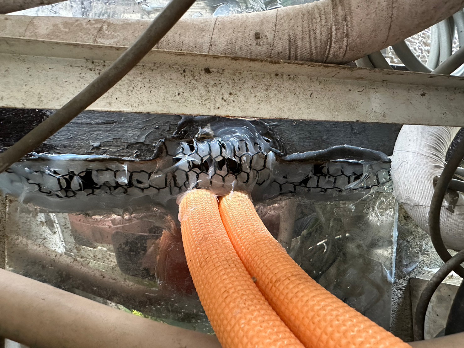 続いて、パンチングメタルや金網、コーキング剤などを用いて、あらゆる侵入経路を封鎖していきます。これによりネズミに限らず、他の害獣の再侵入も防ぐことができます。