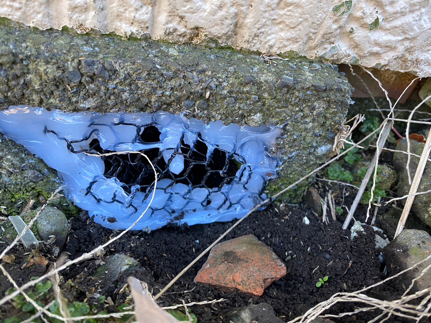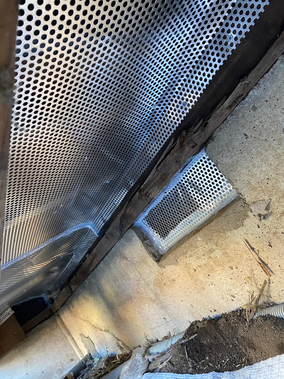 続いて、パンチングメタルや金網、コーキング剤などを用いて、あらゆる侵入経路を封鎖していきます。これによりアライグマに限らず、他の害獣の再侵入も防ぐことができます。
