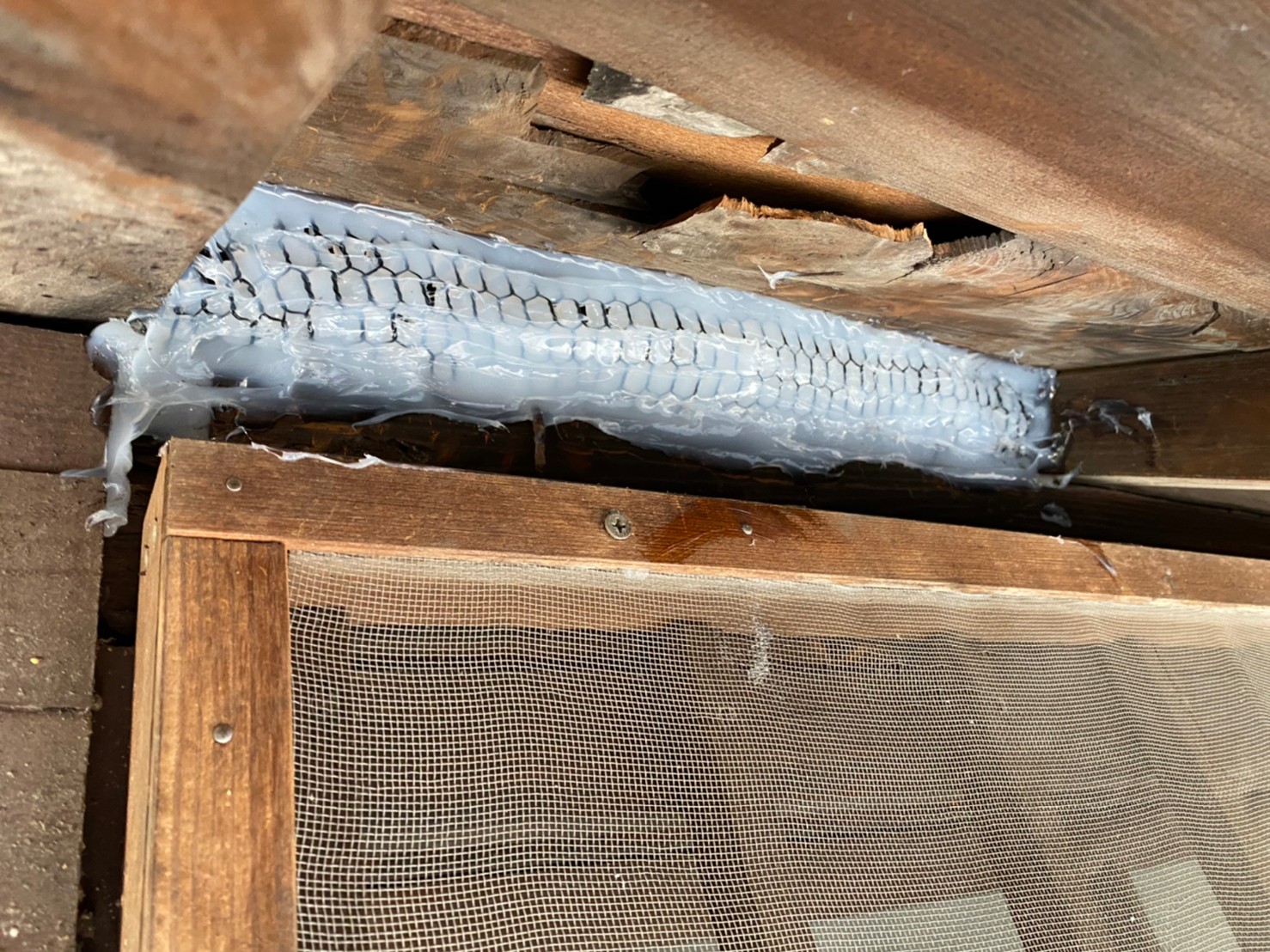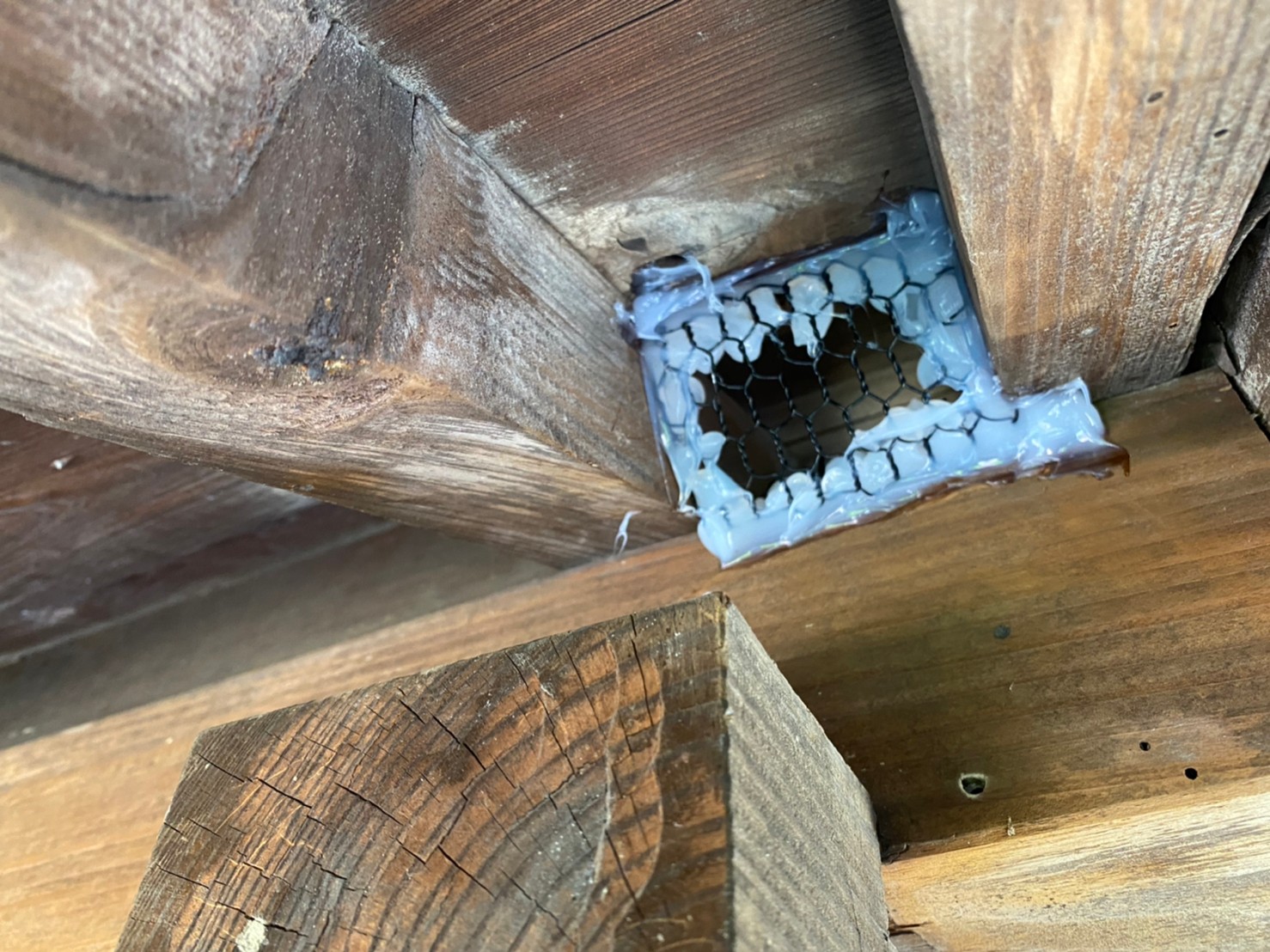 続いて、パンチングメタルや金網、コーキング剤などを用いて、あらゆる侵入経路を封鎖していきます。これによりネズミ、アライグマに限らず、他の害獣の再侵入も防ぐことができます。