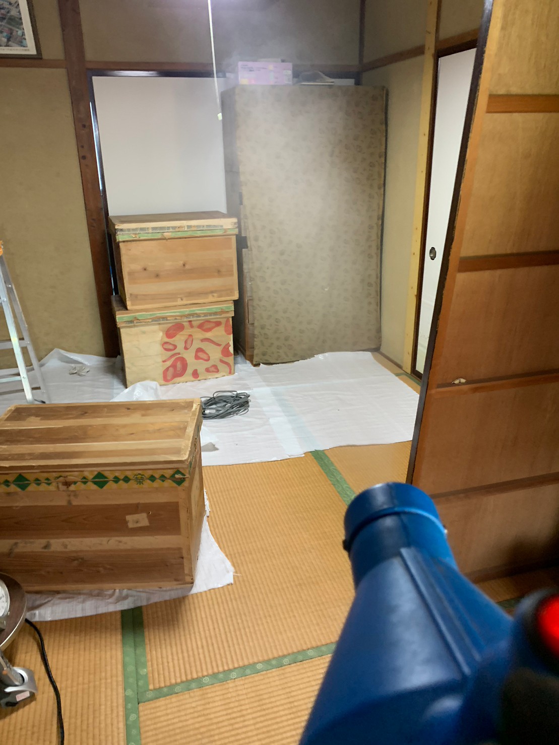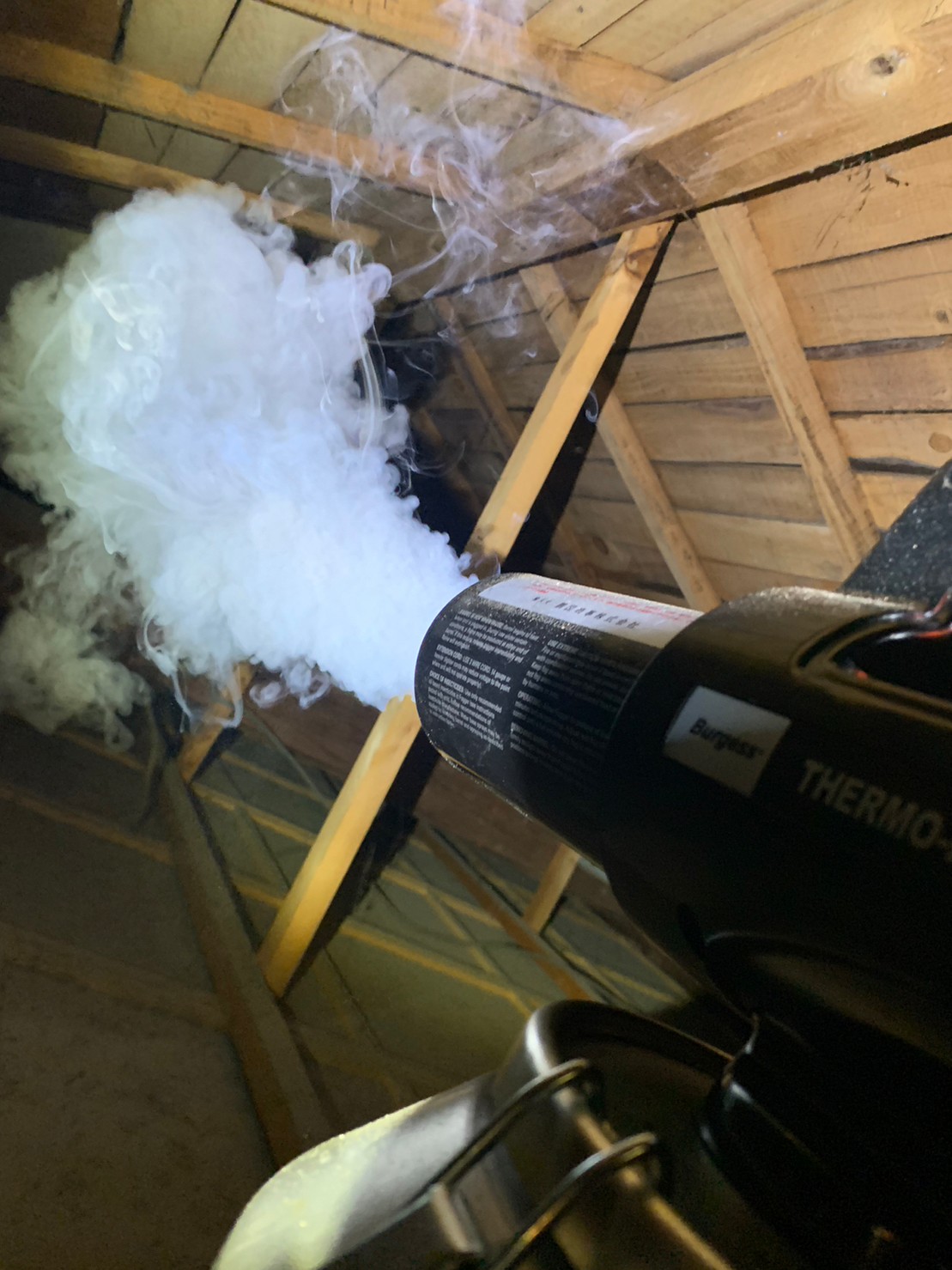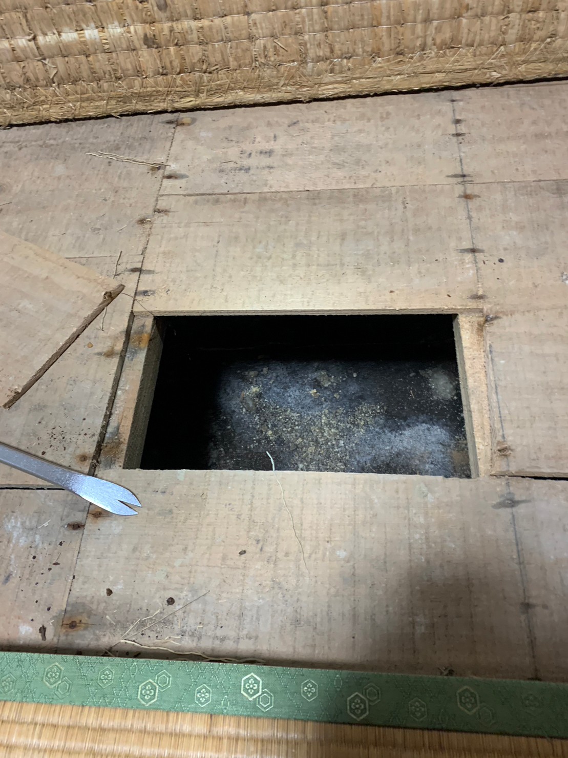 作業の初めに、ネズミの糞清掃や様々な作業を徹底して行えるように点検口を作成し、燻煙剤を使って屋内に潜んでいる個体を追い出します。