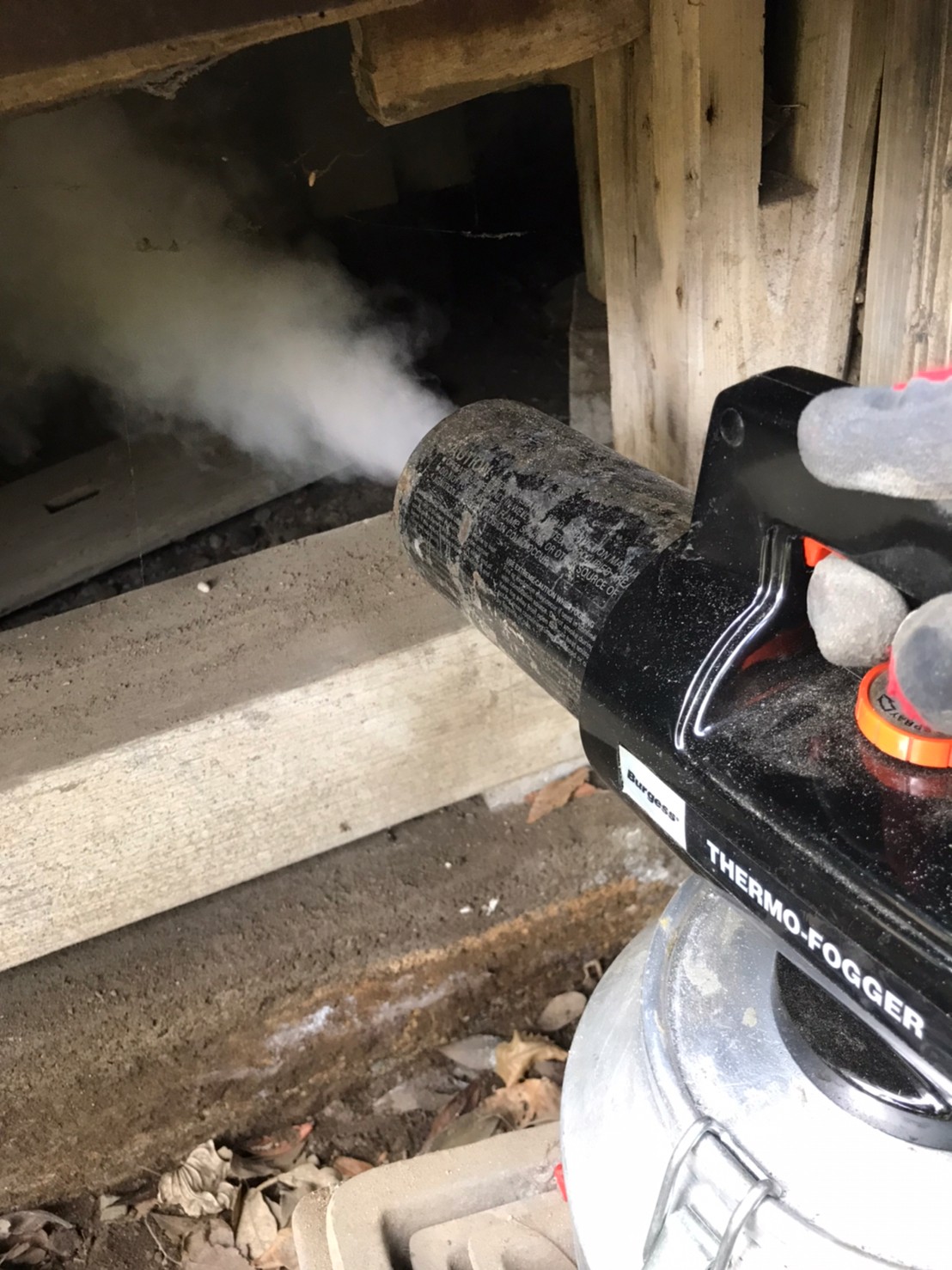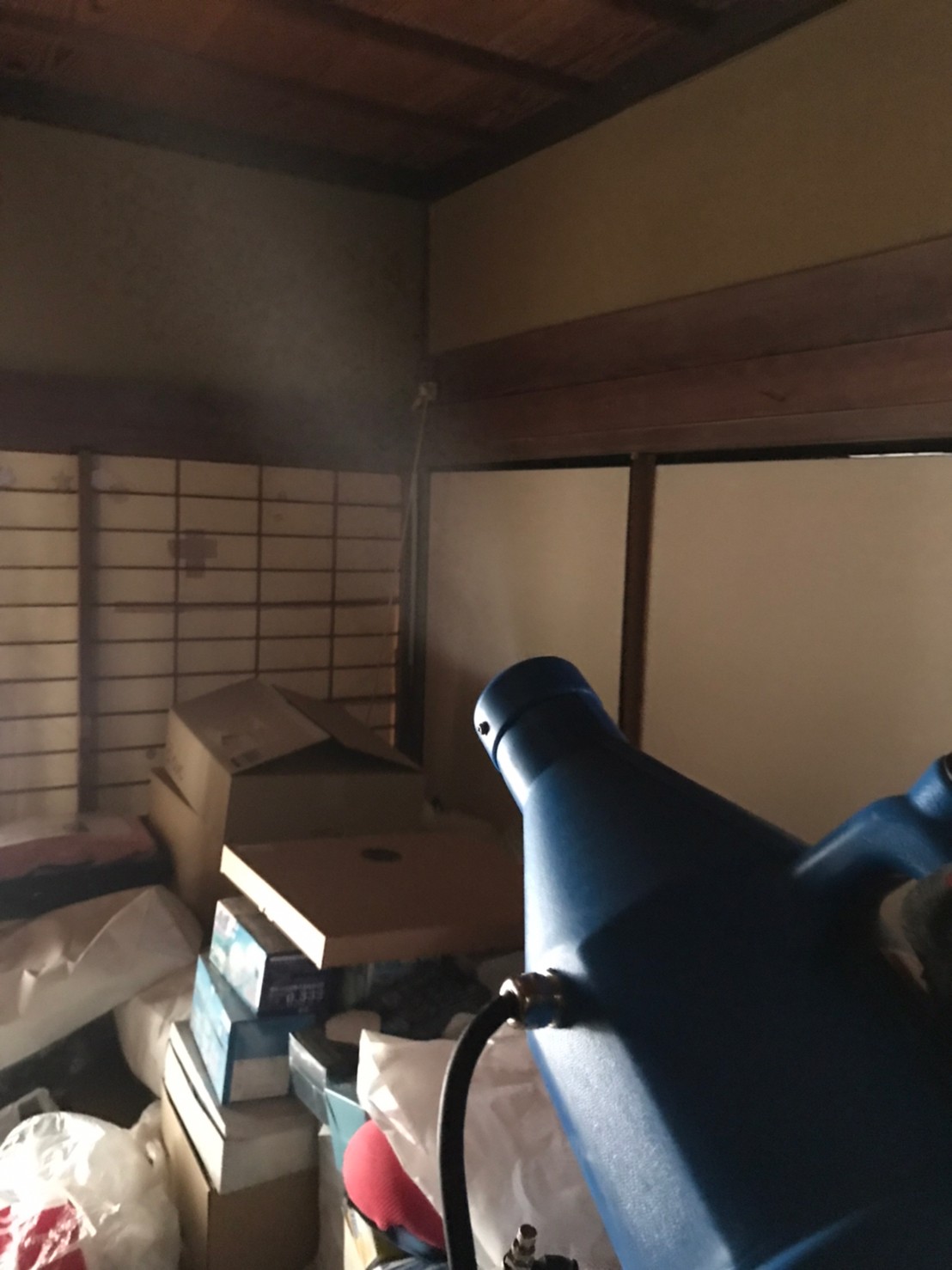 封鎖作業の後は、糞清掃や殺菌・消毒、マーキング消臭、ノミ・ダニ駆除、点検口作成といった残りの行程を順序良く行い、終了です。