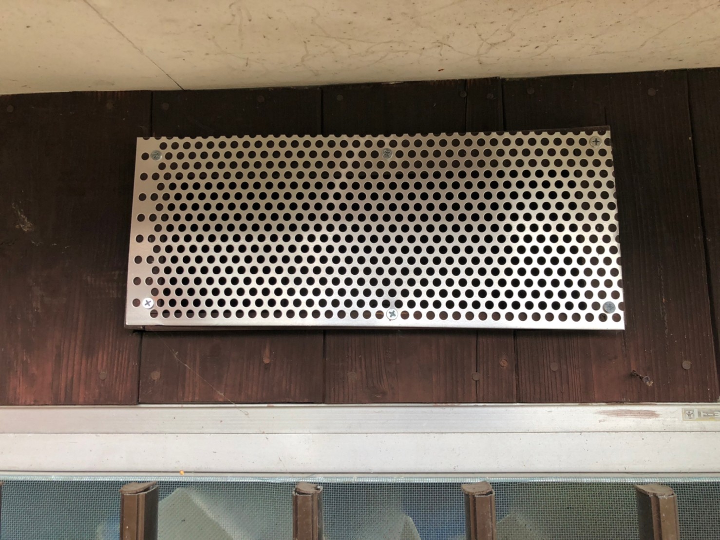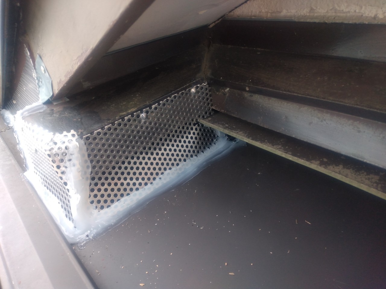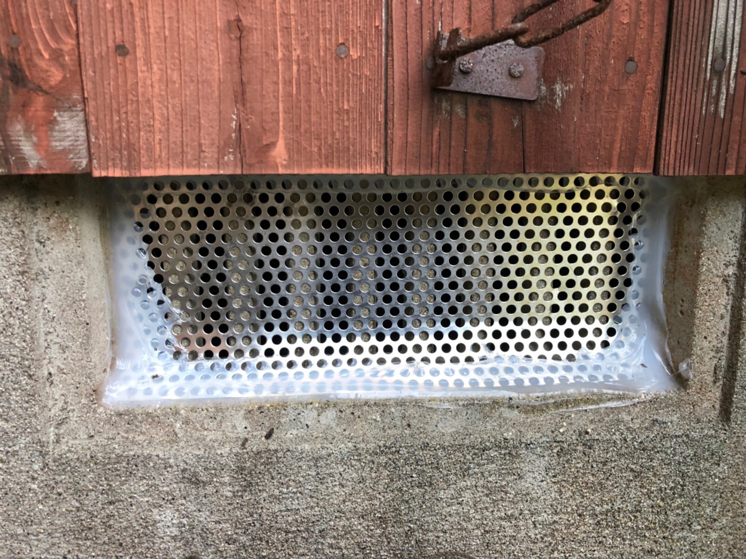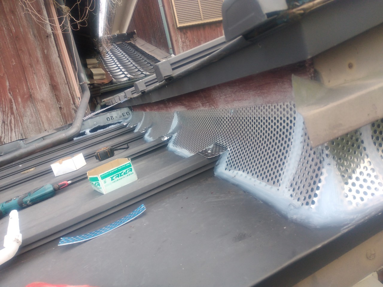 続いて、アライグマの再侵入を防ぐために、パンチングメタルや金網、コーキング剤などを用いて侵入経路の封鎖を行います。