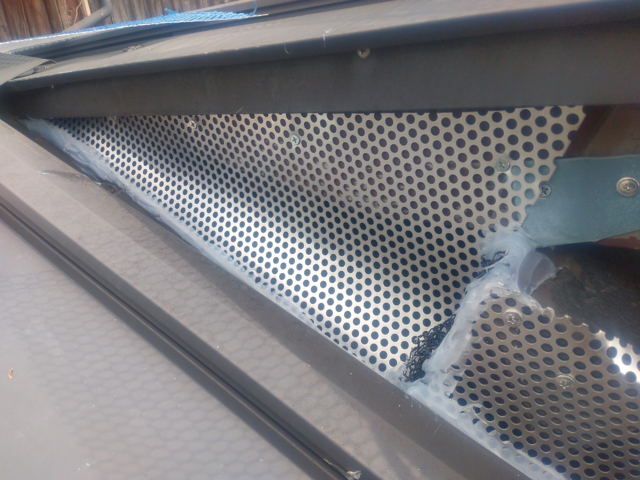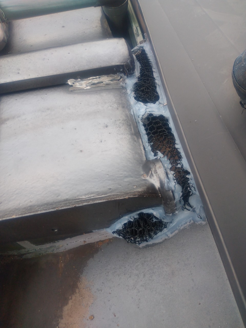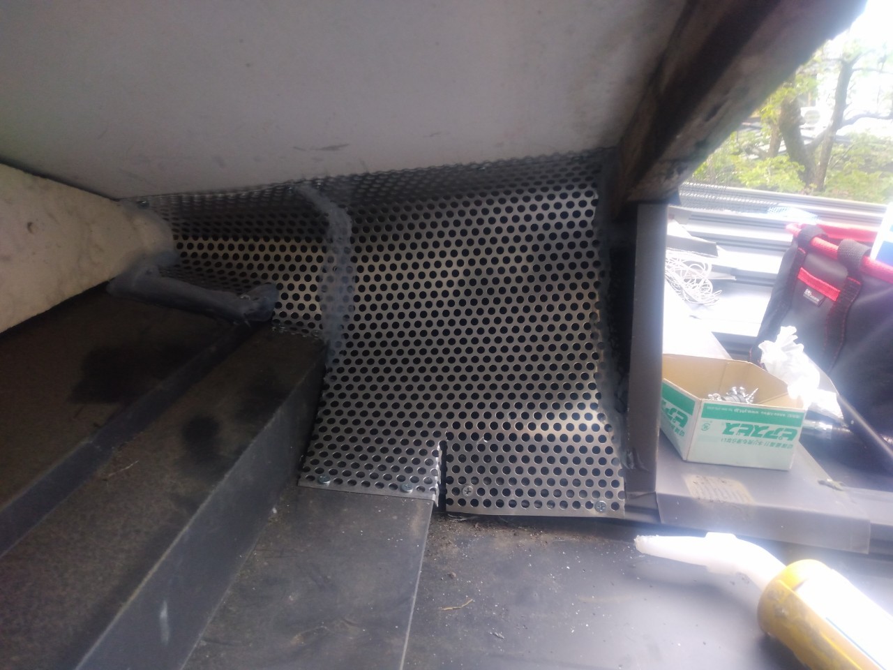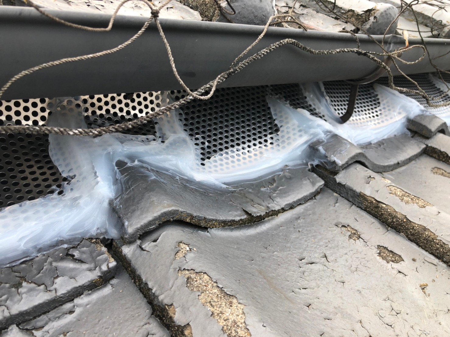 続いて、アライグマの再侵入を防ぐために、パンチングメタルや金網、コーキング剤などを用いて侵入経路の封鎖を行います。