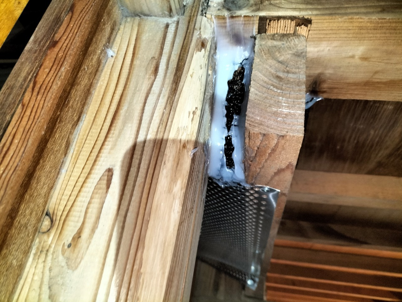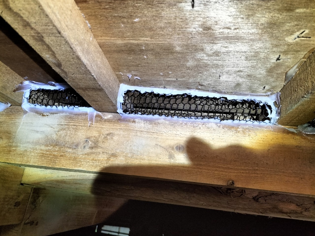 続いて、ネズミの再侵入を防ぐために、パンチングメタルや金網、コーキング剤などを用いて侵入経路の封鎖を行います。