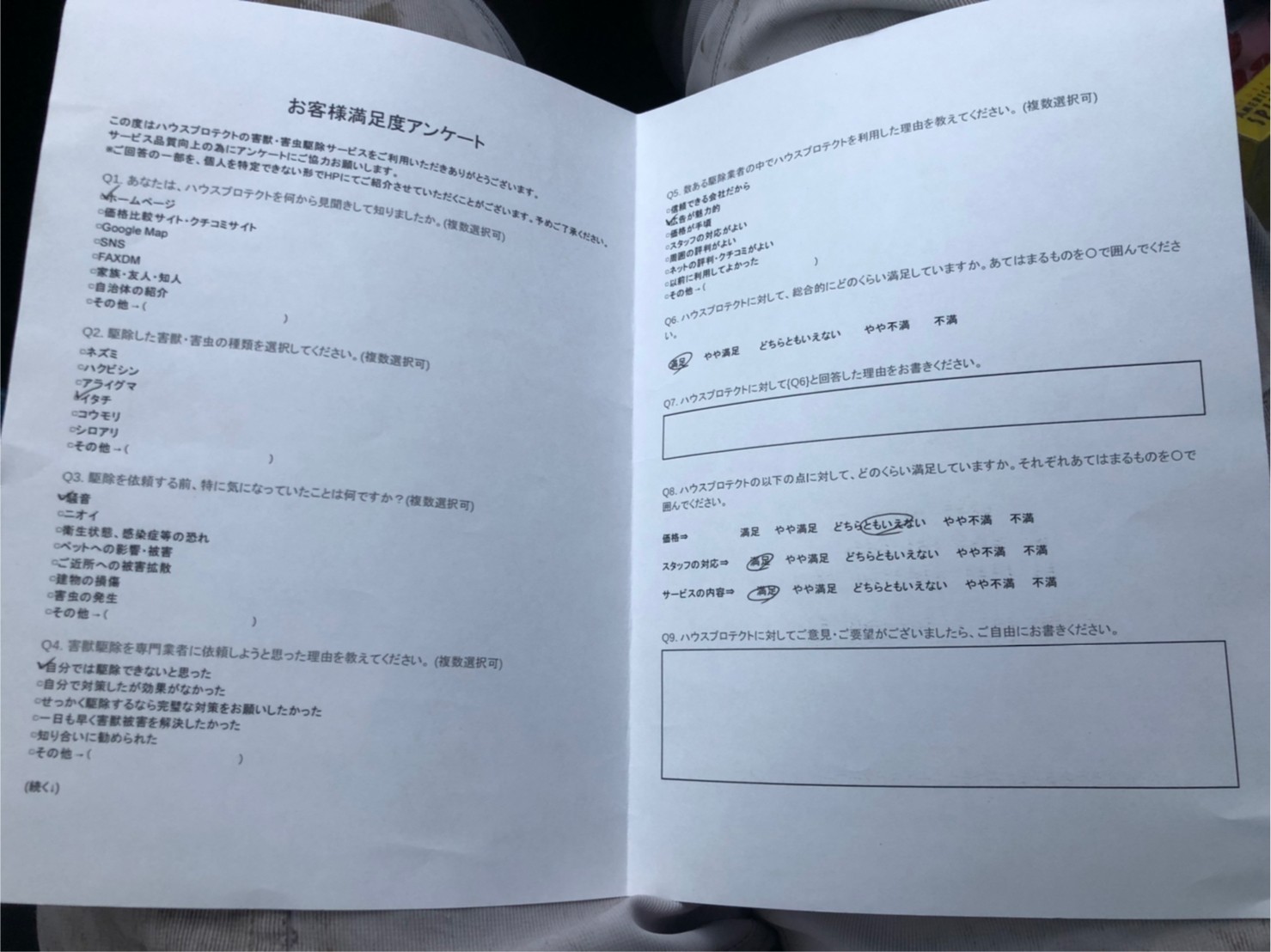 徹底的な侵入経路の閉鎖と、悪臭を放つ糞尿の処理と、消毒・徹底的な消臭作業をいたしました。