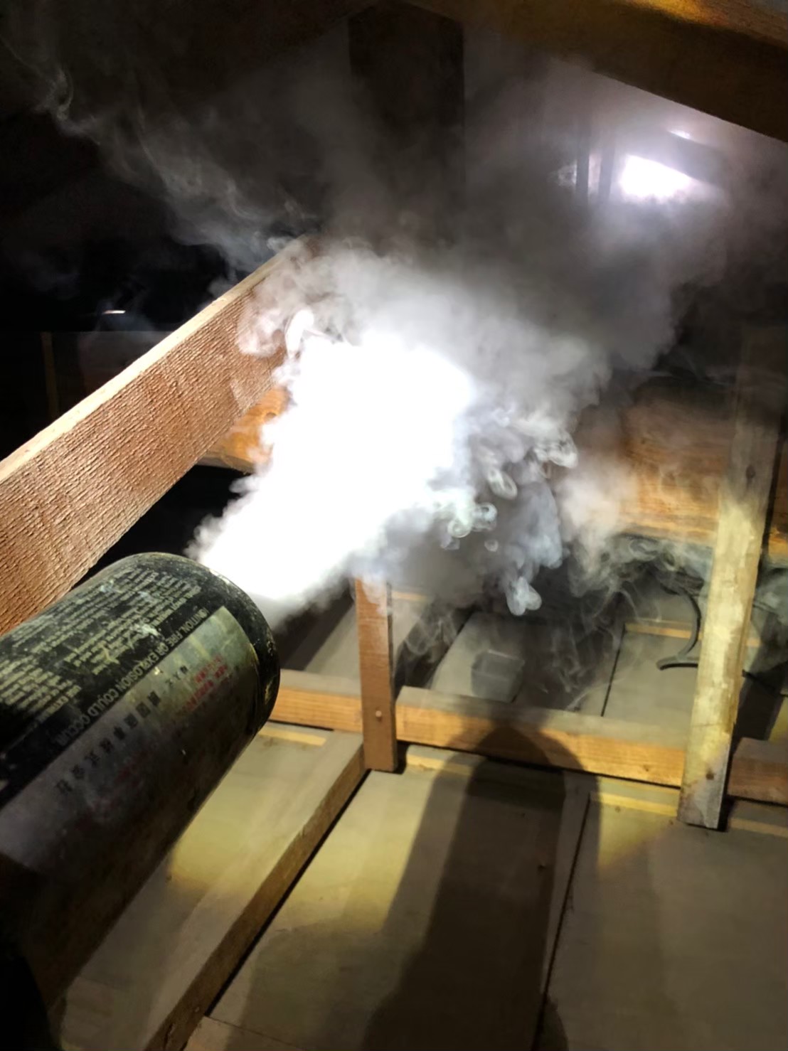 作業の初めに、ネズミの糞清掃や様々な作業を徹底して行えるように点検口を作成し、燻煙剤と呼ばれる薬剤を天井裏や床下に投入することで、ネズミを追い出していきます。