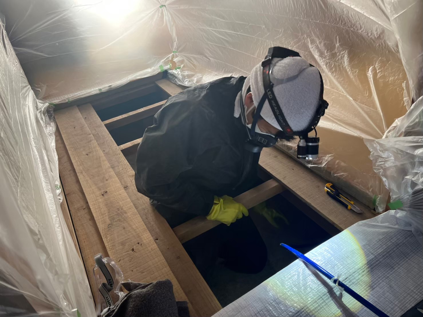 最後に、糞清掃や殺菌・消毒、マーキング消臭、ノミ・ダニ駆除、点検口作成といった残りの作業を行い、駆除~再発防止までの工程が全て終了します。