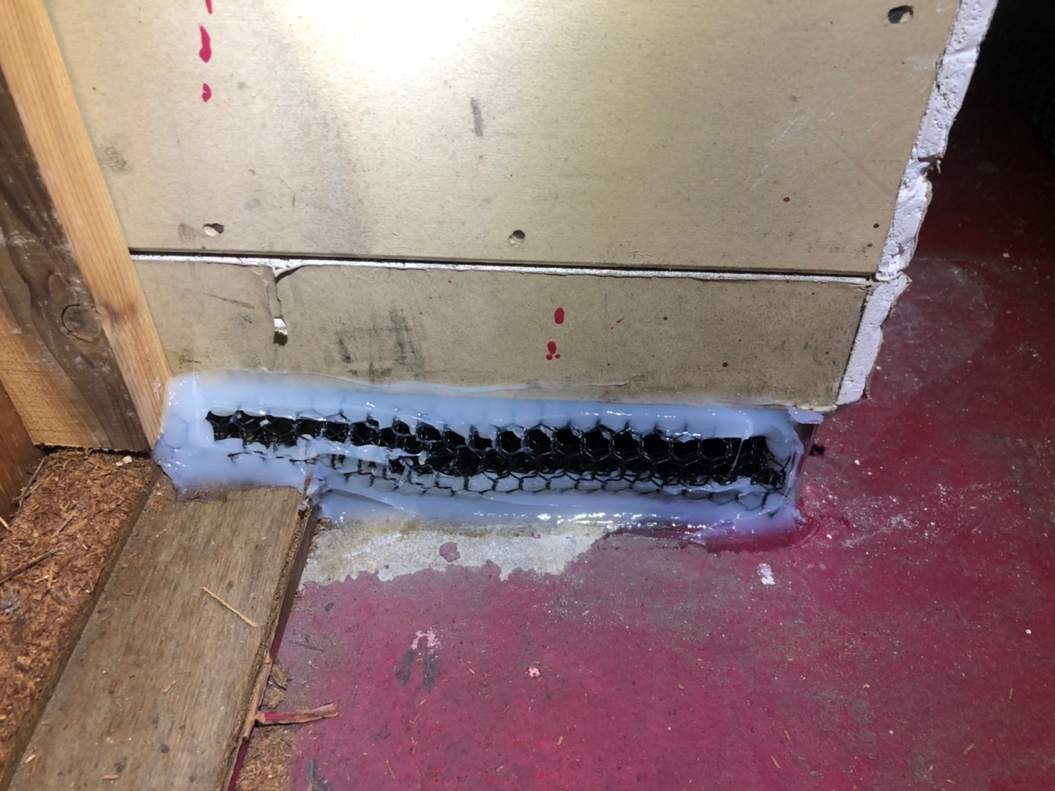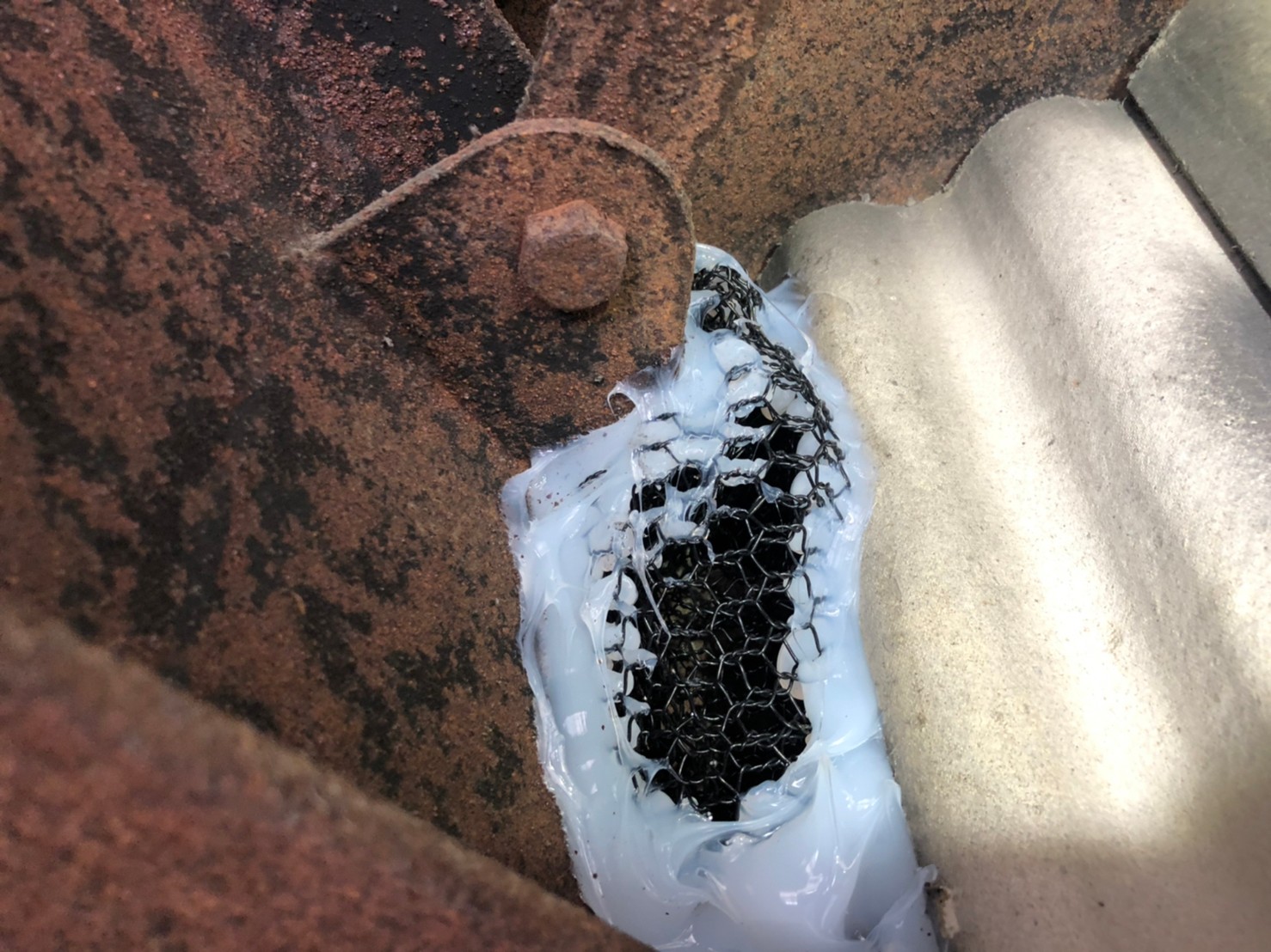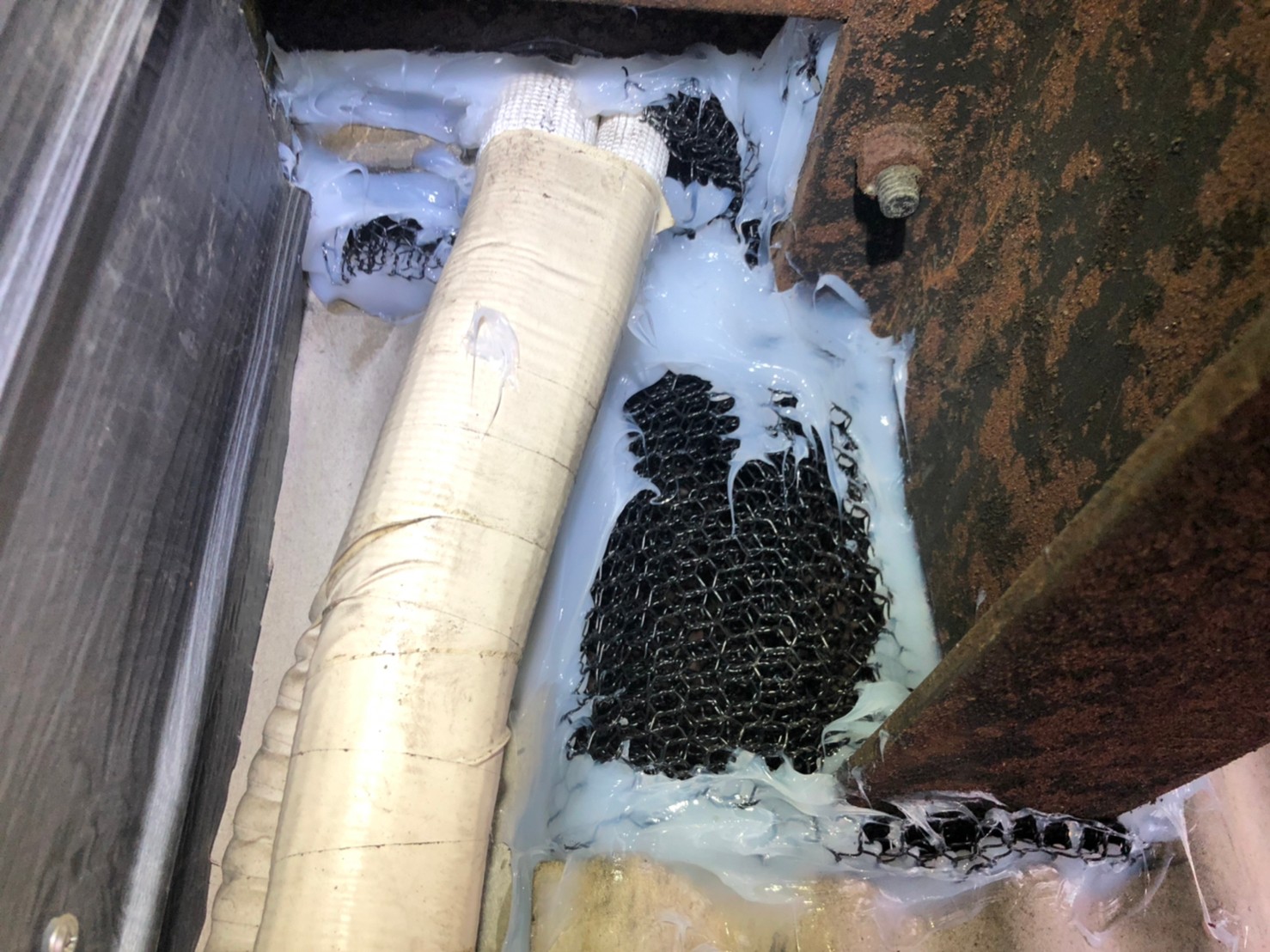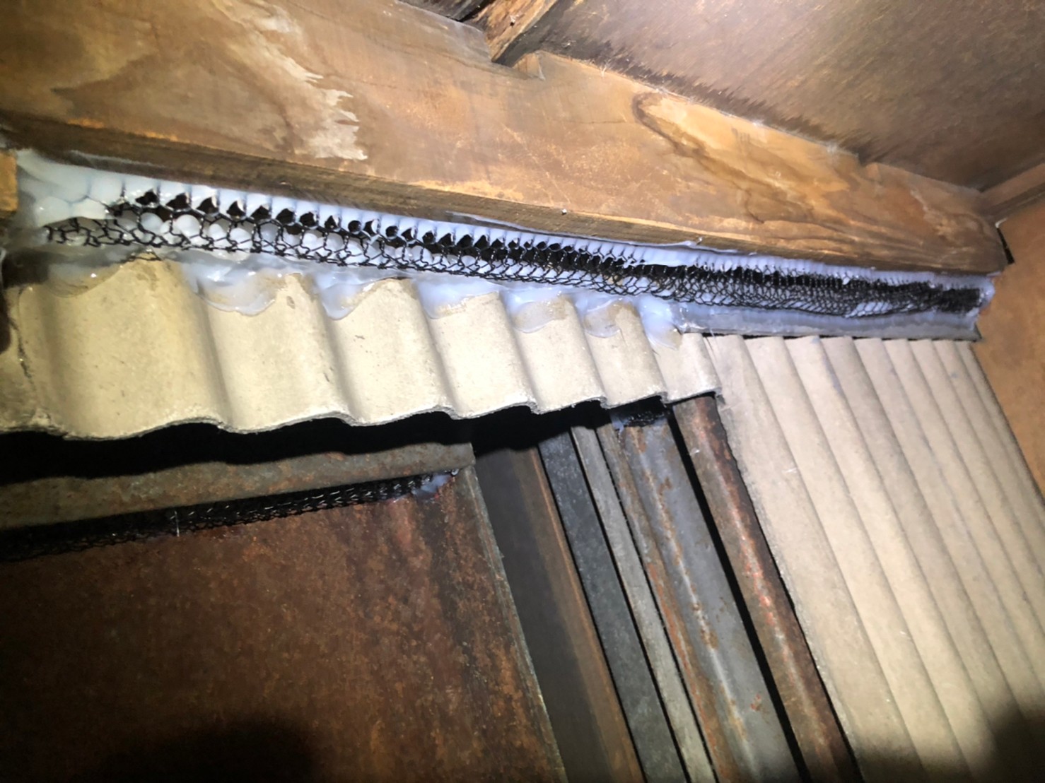 続いて、イタチの再侵入を防ぐために、パンチングメタルや金網、コーキング剤などを用いて侵入経路の封鎖を行います。