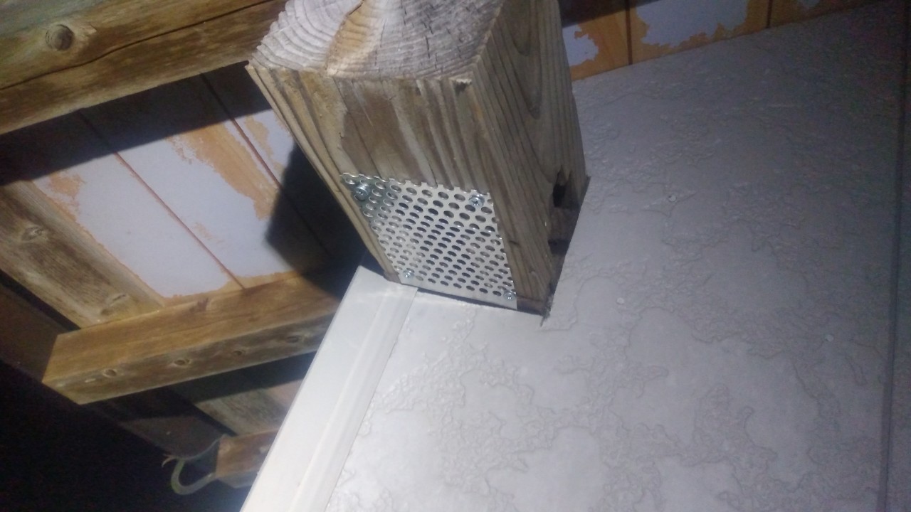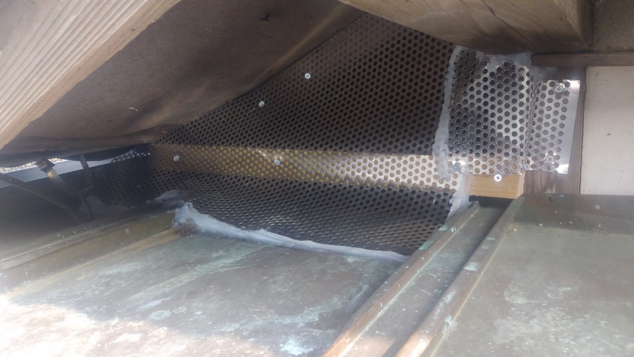 続いて、アライグマの再侵入を防ぐために、パンチングメタルや金網、コーキング剤などを用いて侵入経路の封鎖を行います。