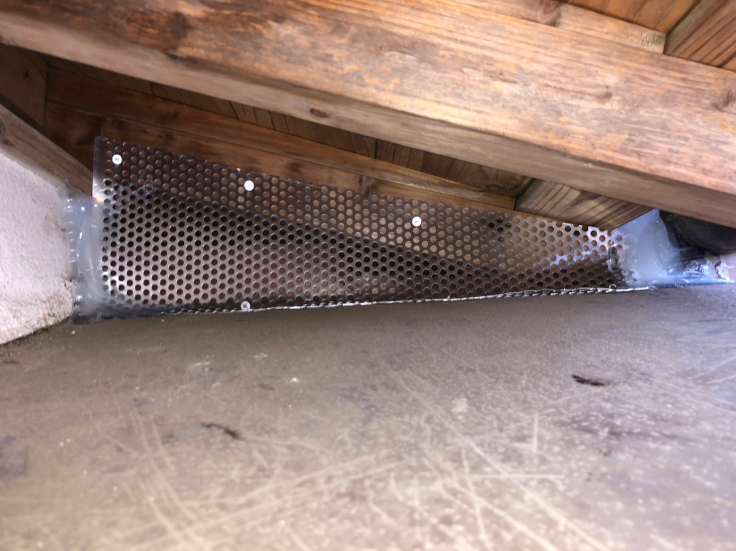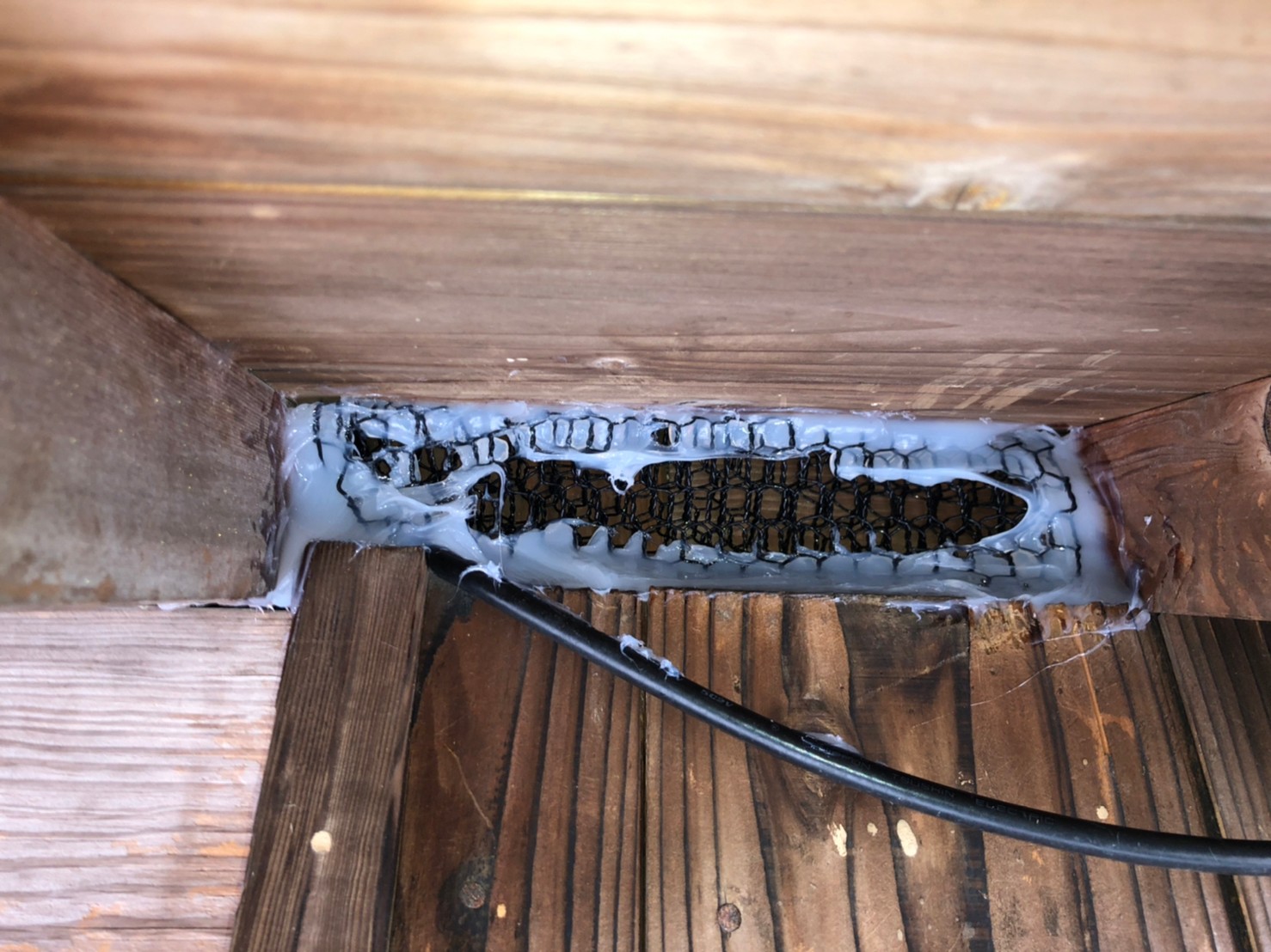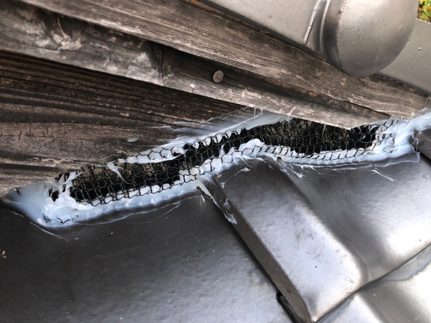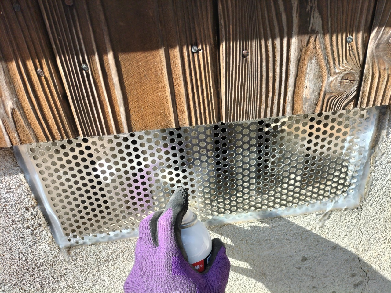 続いて、ネズミ、アライグマの再侵入を防ぐために、パンチングメタルや金網、コーキング剤などを用いて侵入経路の封鎖を行います。