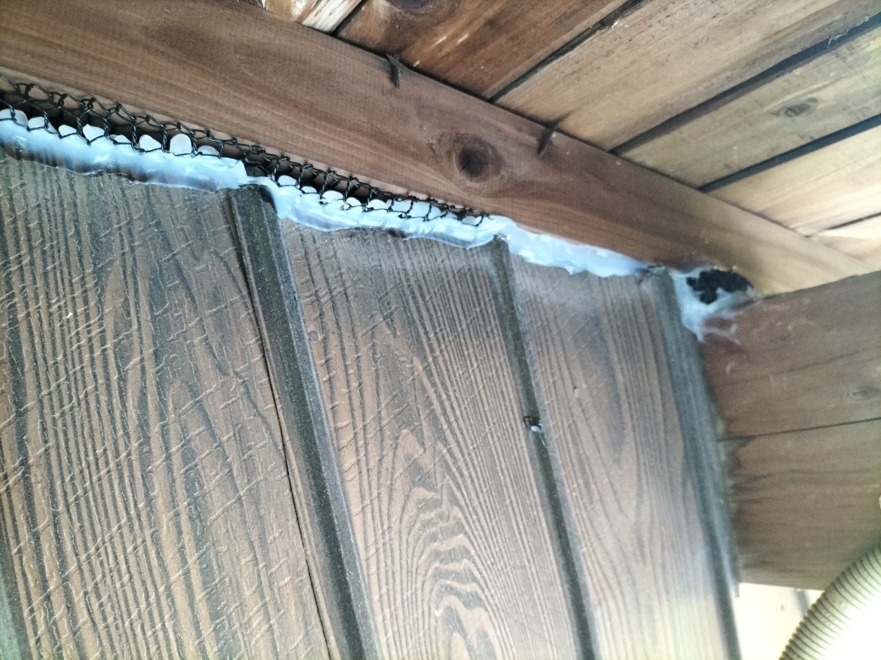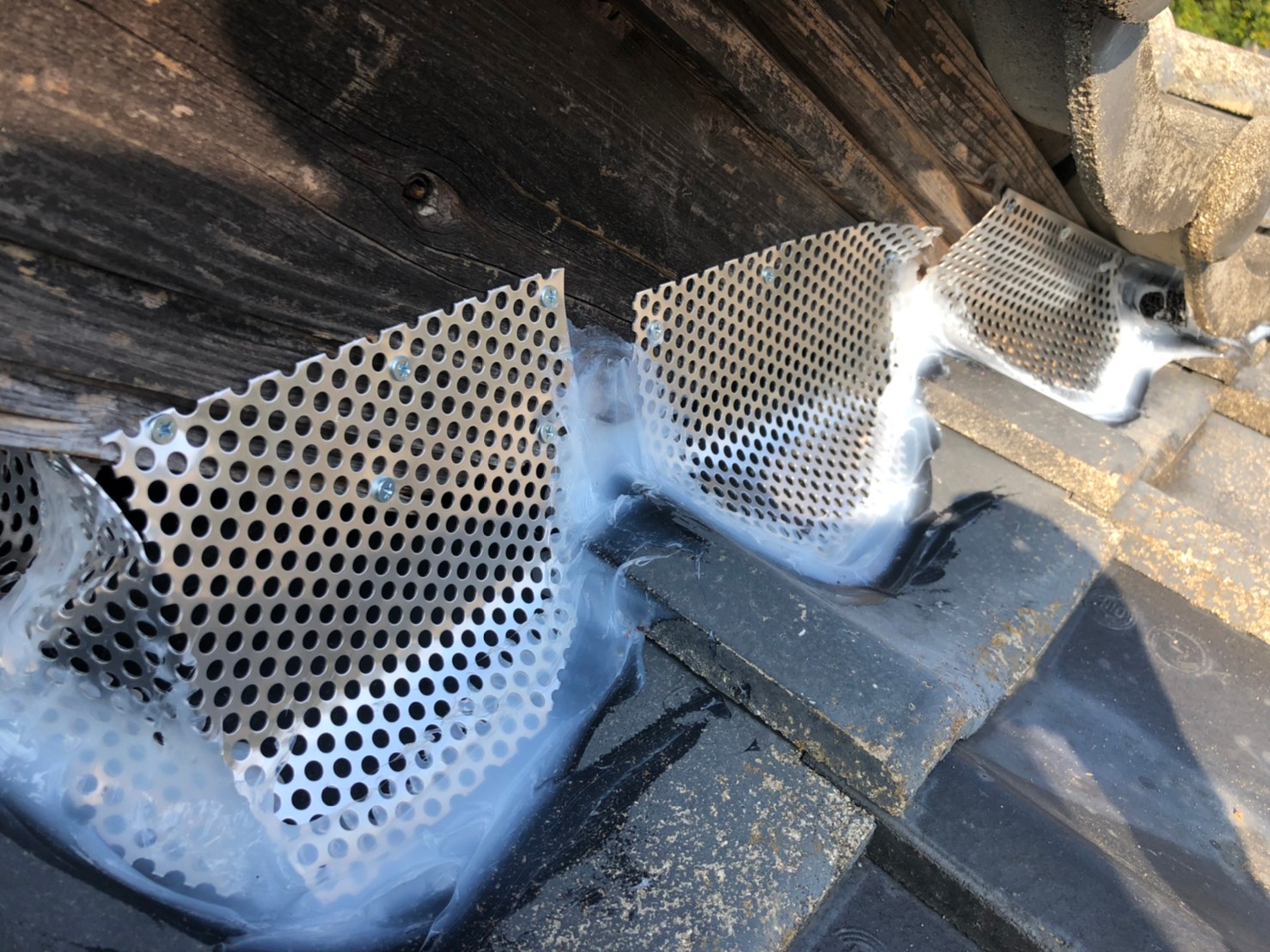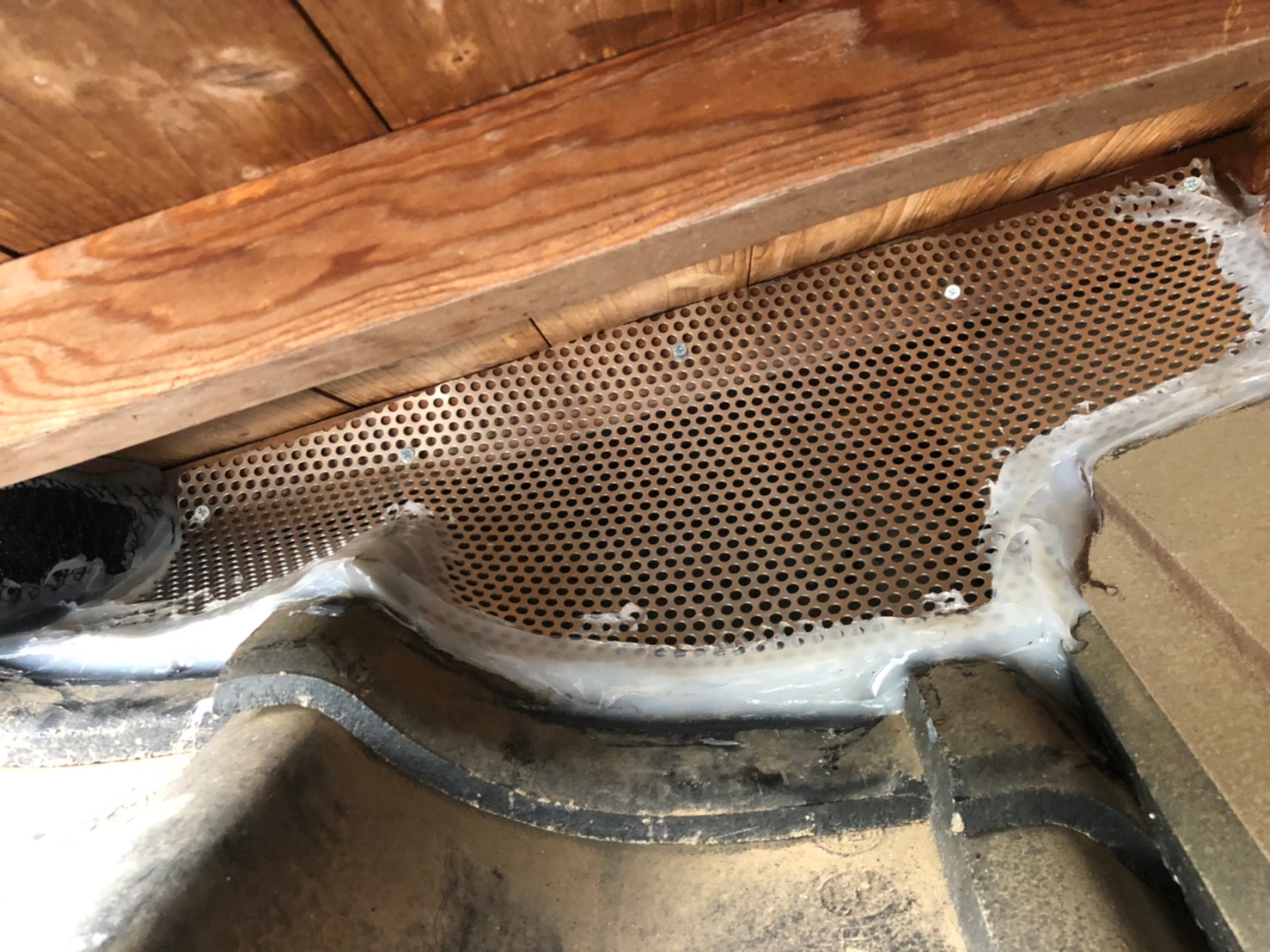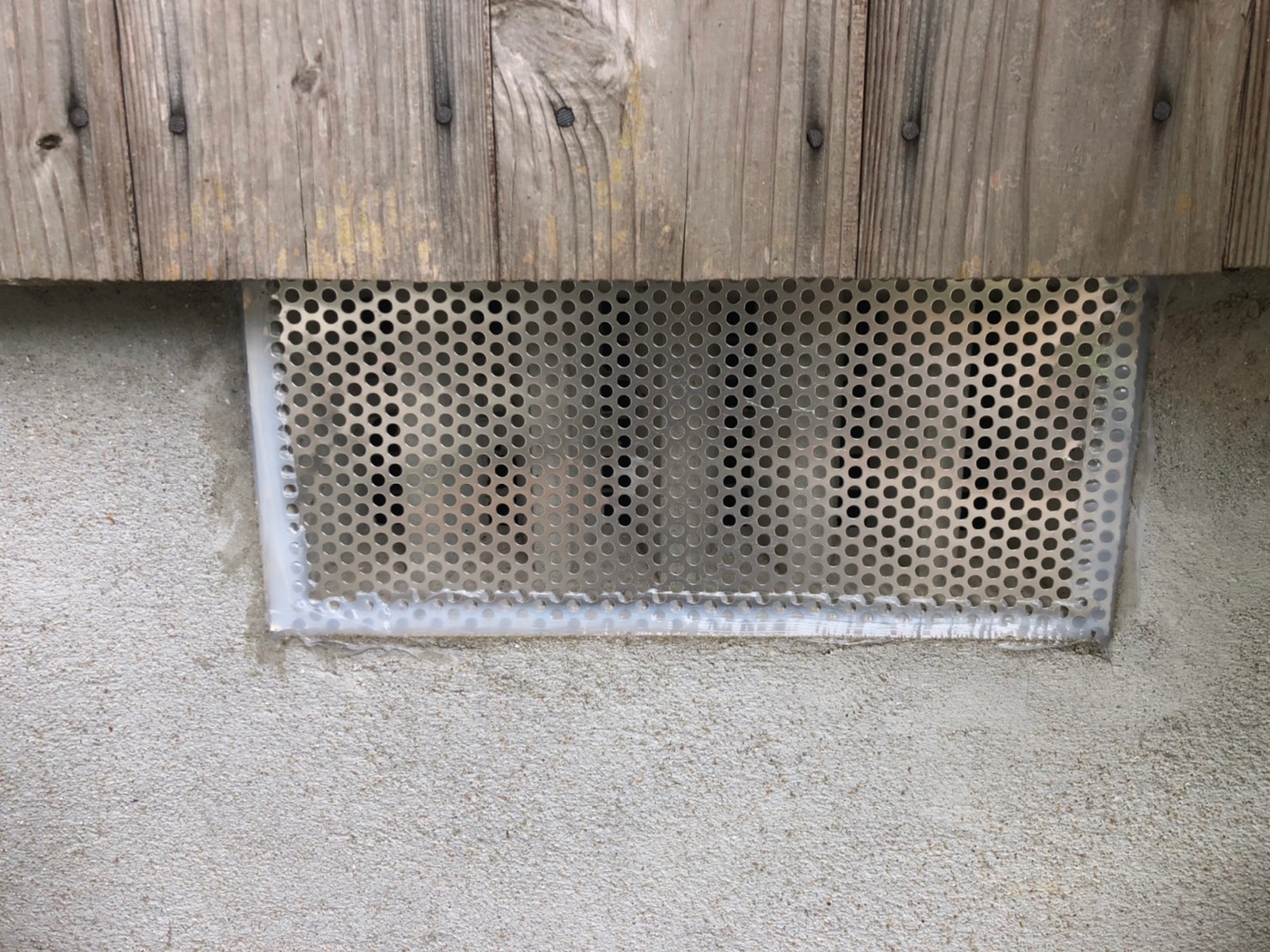 続いて、ネズミ、アライグマの再侵入を防ぐために、パンチングメタルや金網、コーキング剤などを用いて侵入経路の封鎖を行います。