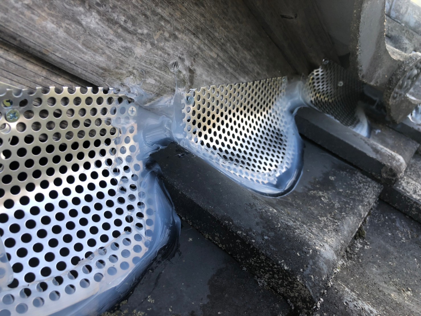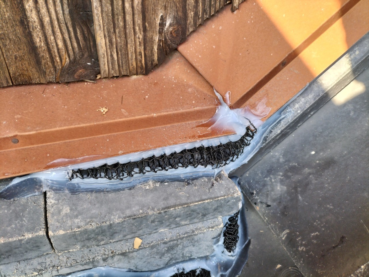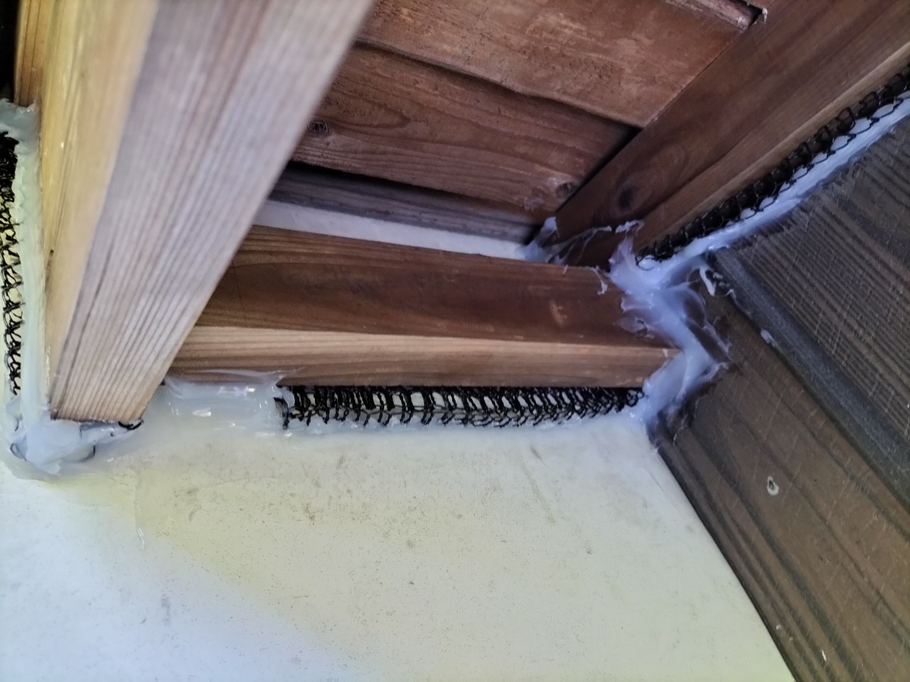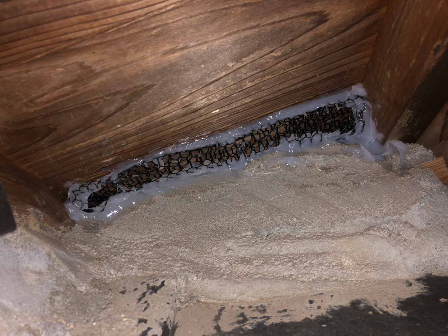 続いて、ネズミ、アライグマの再侵入を防ぐために、パンチングメタルや金網、コーキング剤などを用いて侵入経路の封鎖を行います。