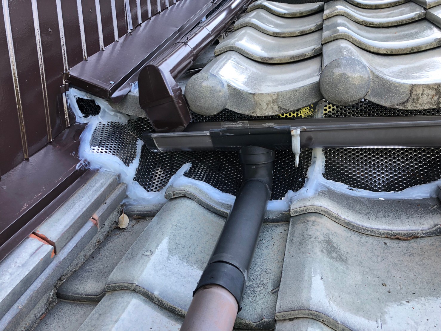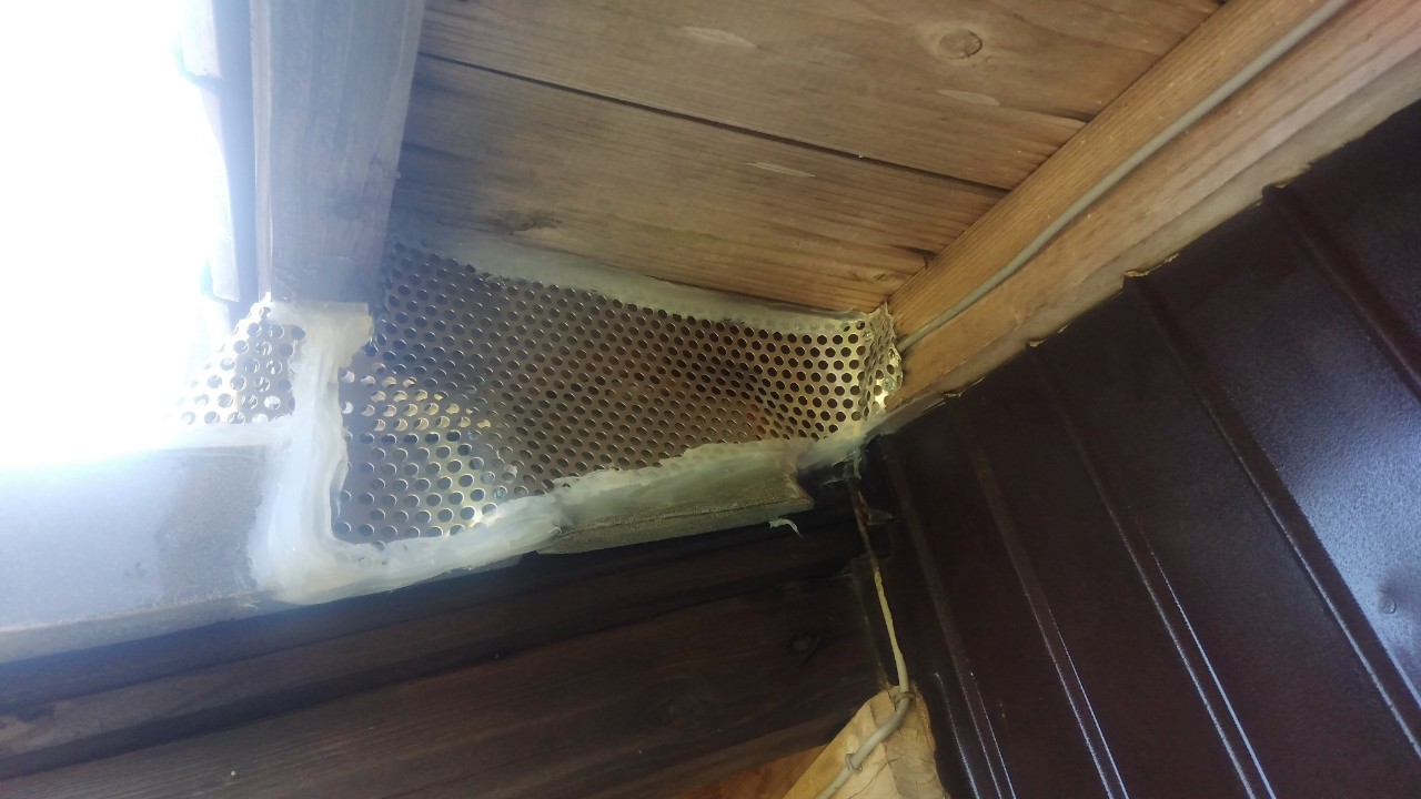 続いて、アライグマの再侵入を防ぐために、パンチングメタルや金網、コーキング剤などを用いて侵入経路の封鎖を行います。