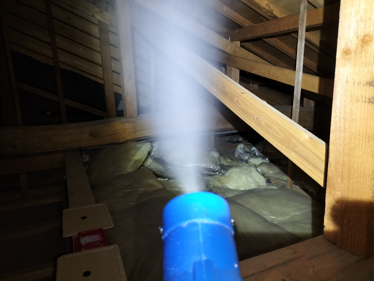 まずは、燻煙剤と呼ばれる薬剤を天井裏や床下に投入することで、ネズミ、コウモリを追い出していきます。