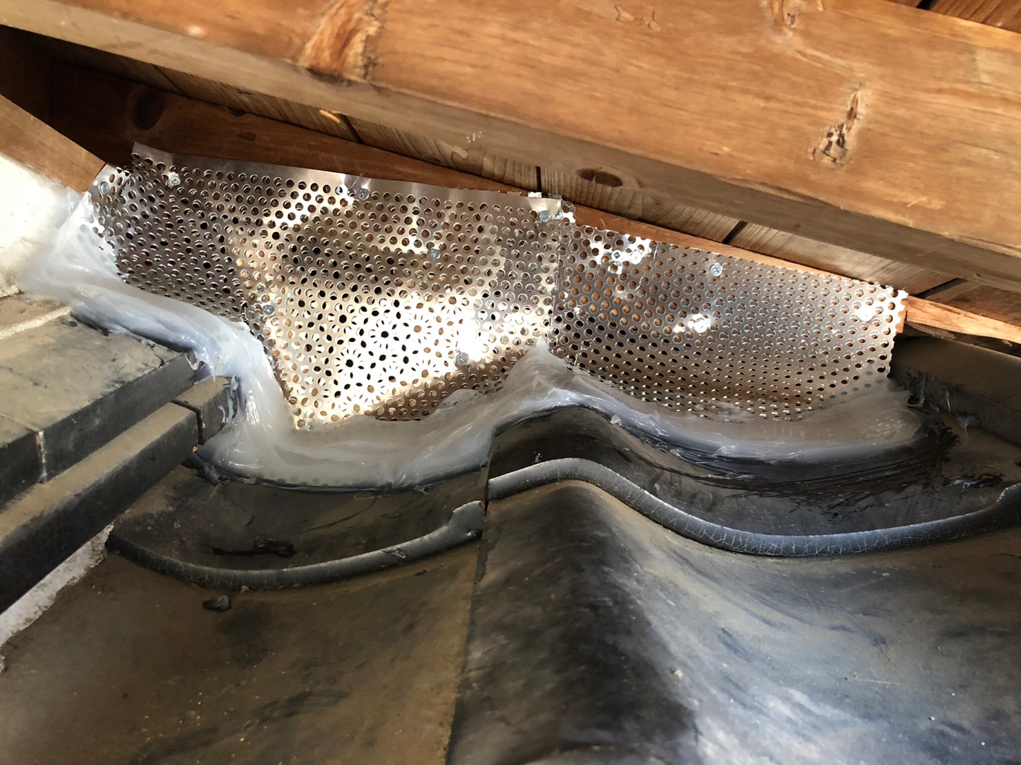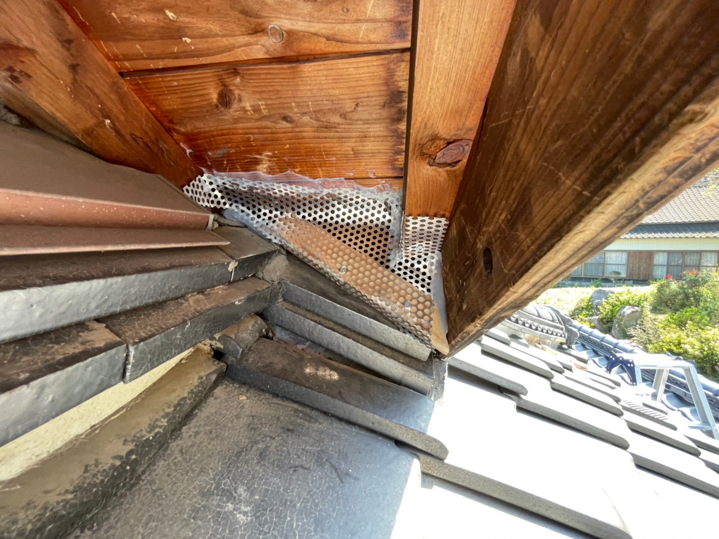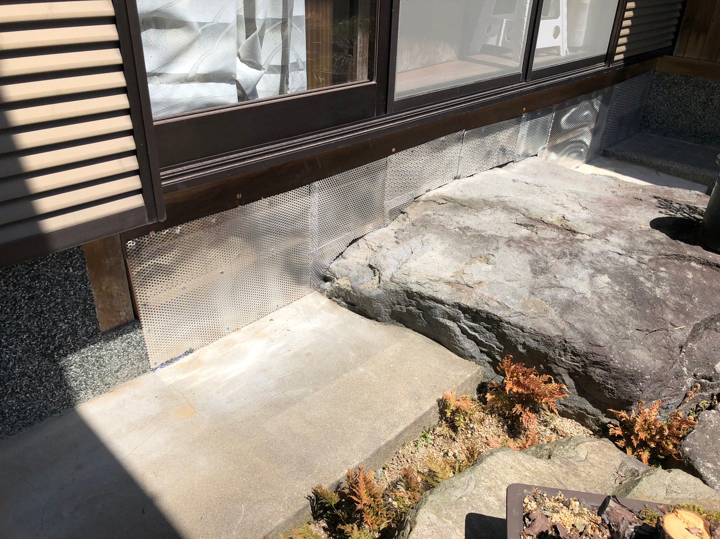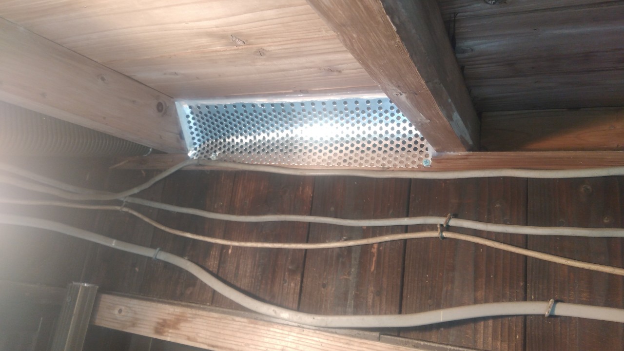 続いて、パンチングメタルや金網、コーキング剤などを用いて、あらゆる侵入経路を封鎖していきます。これによりイタチ、アライグマに限らず、他の害獣の再侵入も防ぐことができます。