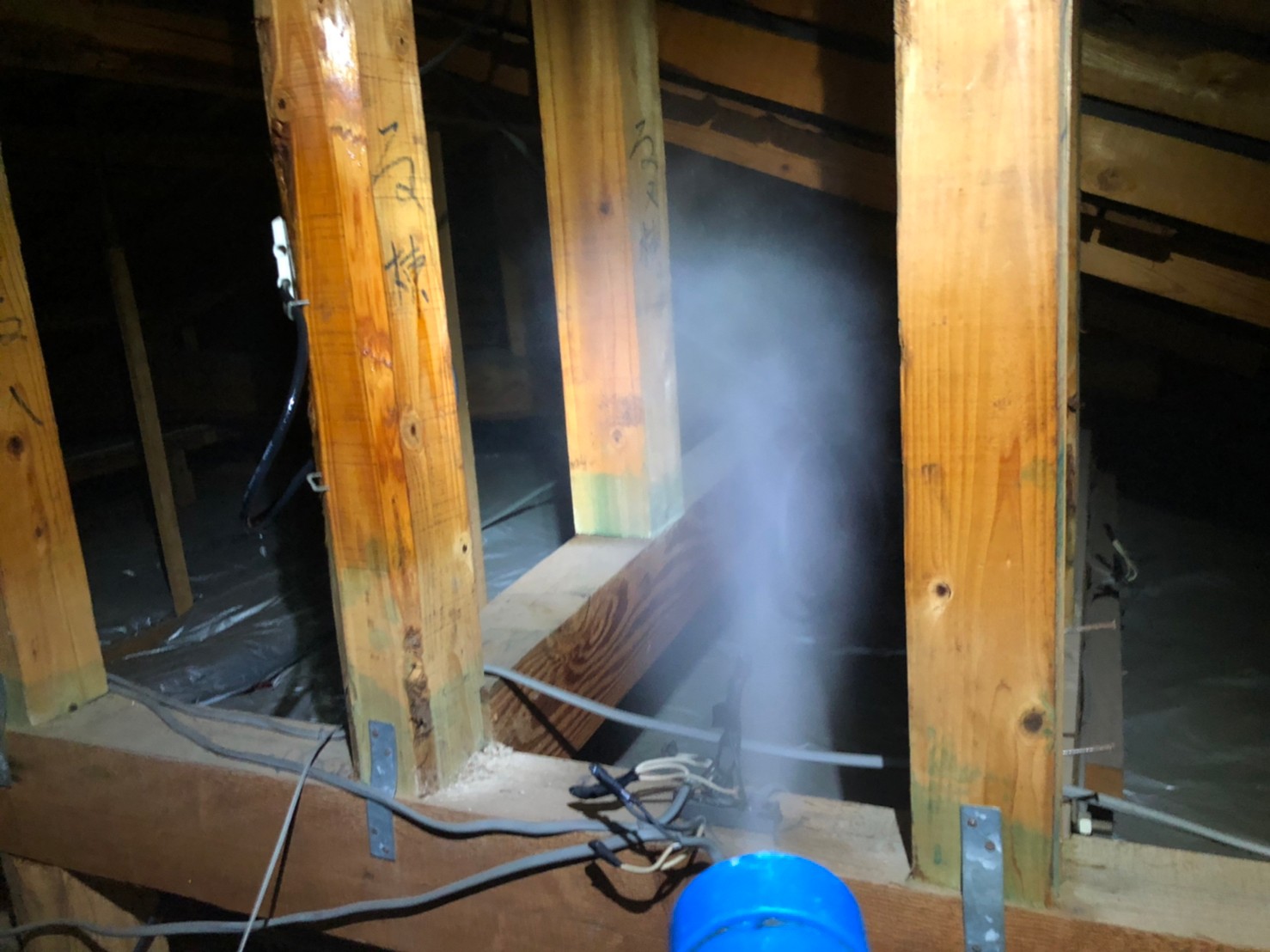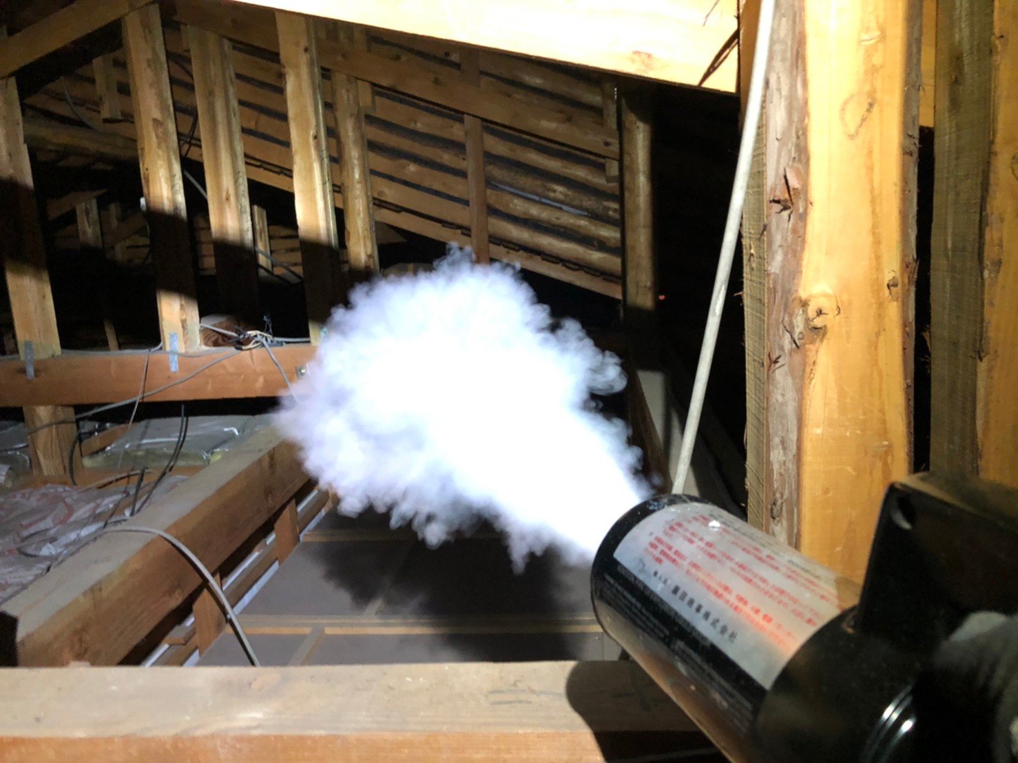 まずは、燻煙剤と呼ばれる薬剤を天井裏や床下に投入することで、ネズミ、イタチを追い出していきます。