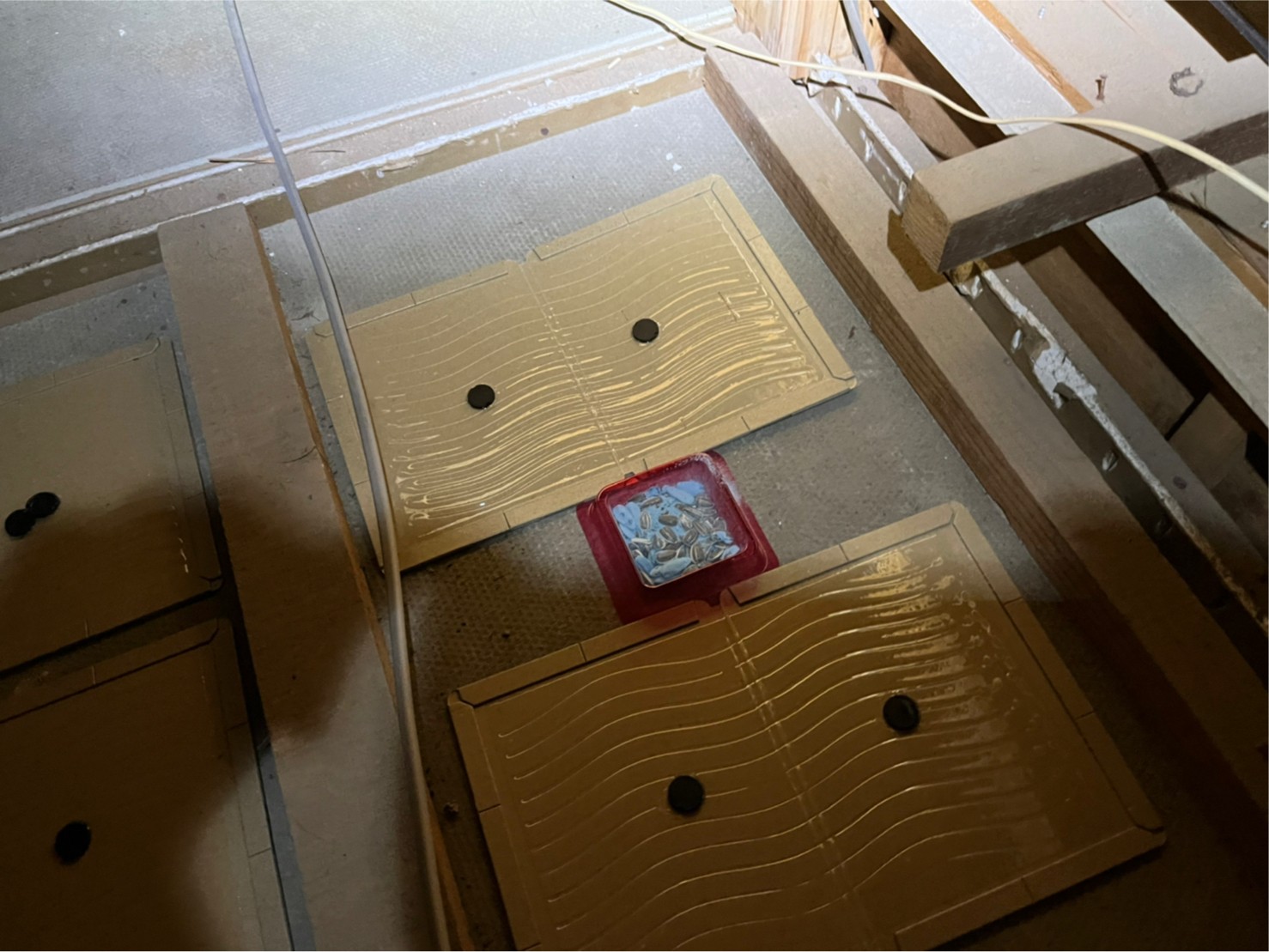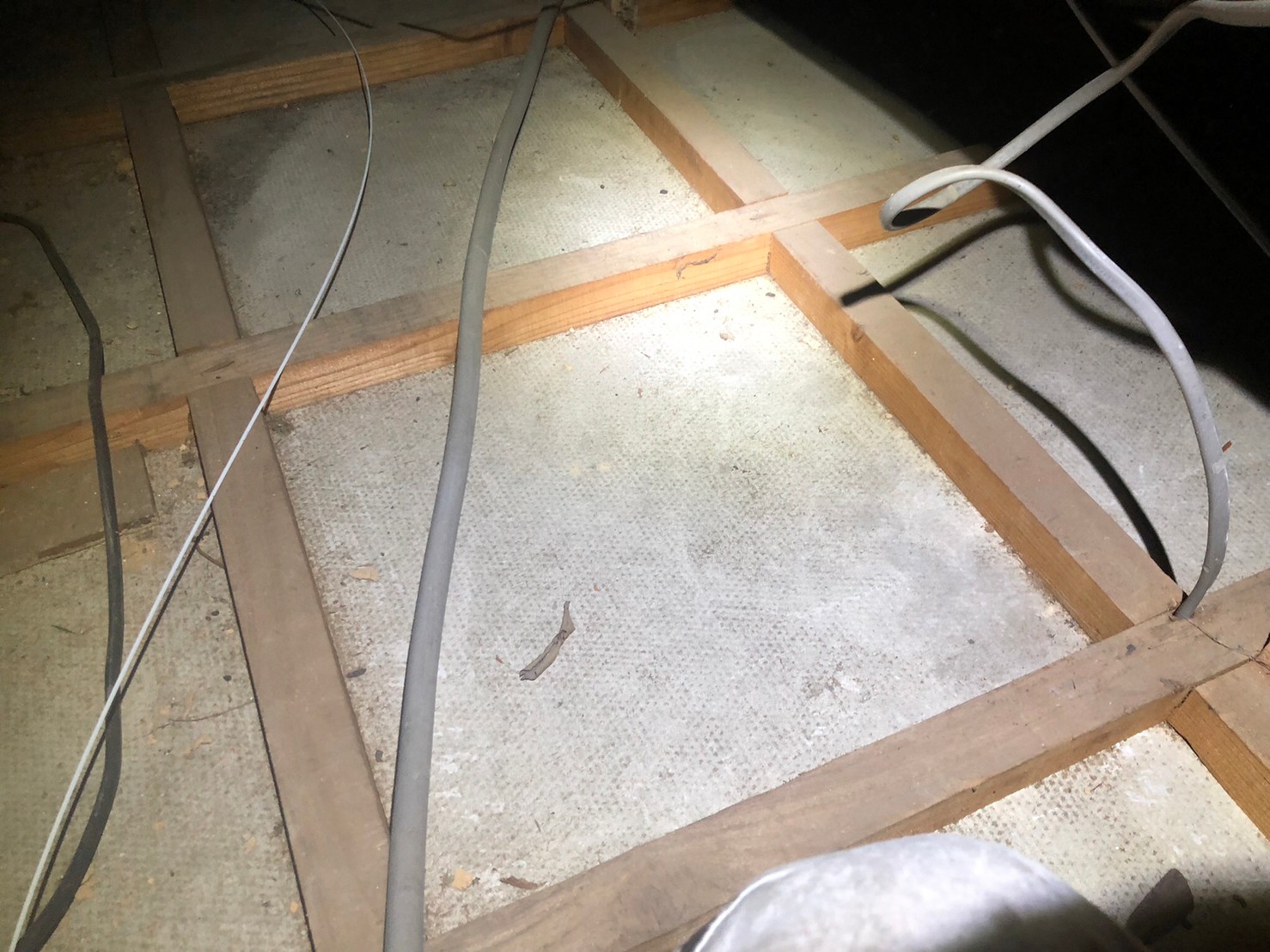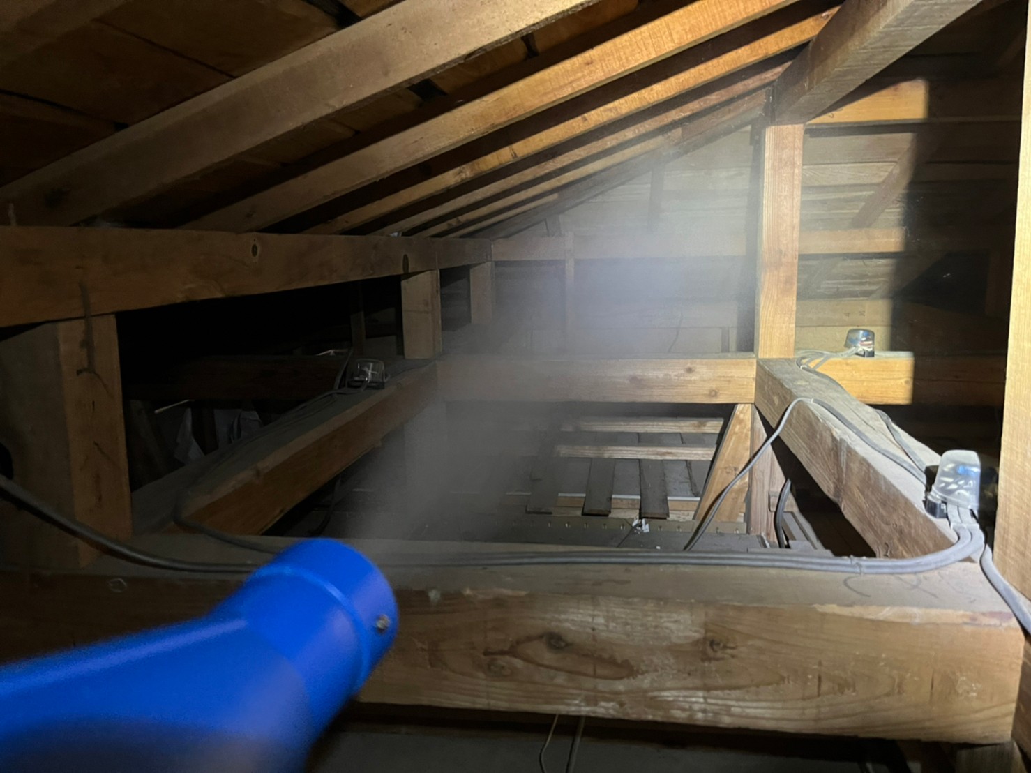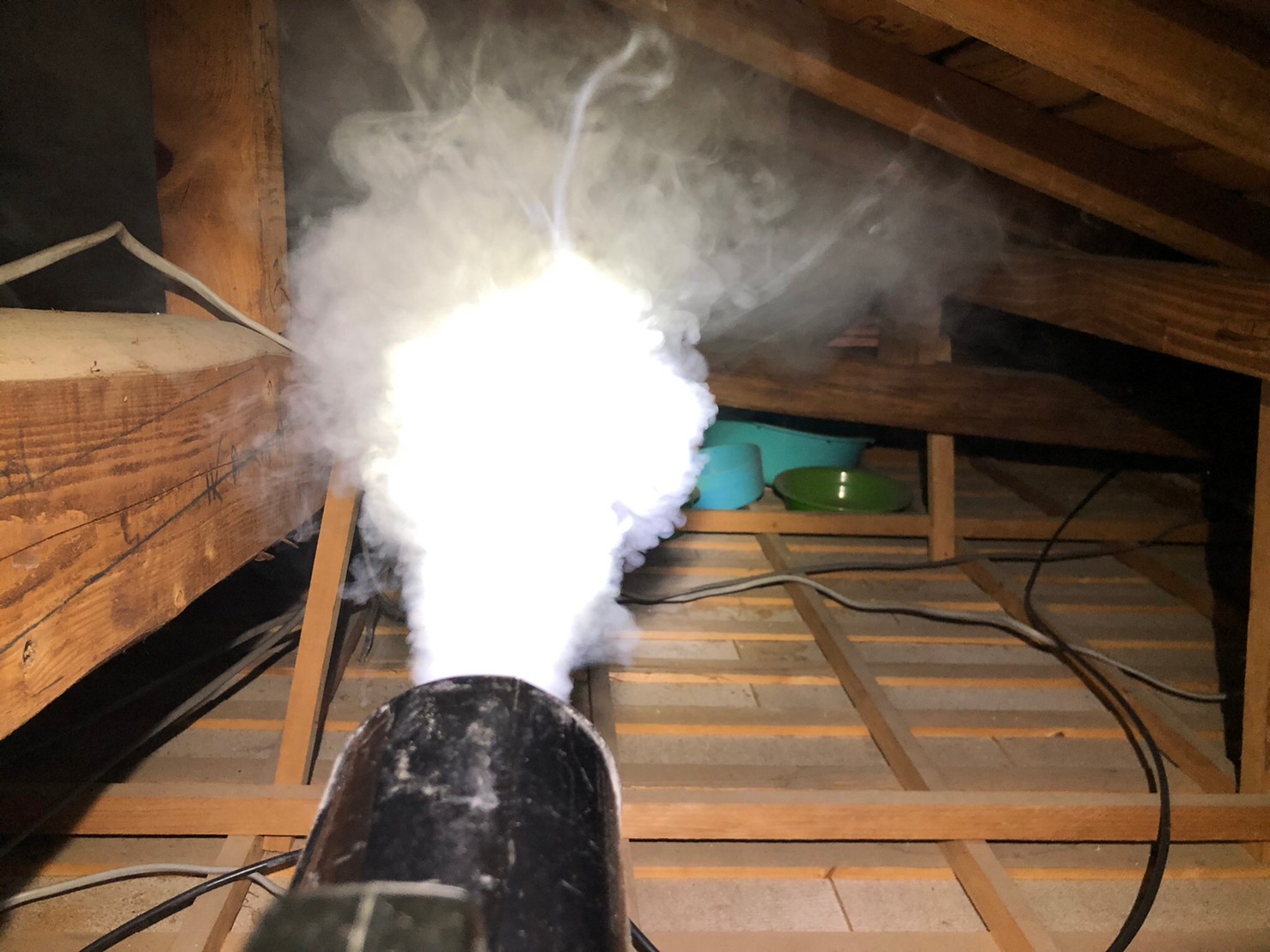 作業の初めに、イタチ、アライグマの糞清掃や様々な作業を徹底して行えるように点検口を作成し、燻煙剤と呼ばれる薬剤を天井裏や床下に投入することで、イタチ、アライグマを追い出していきます。