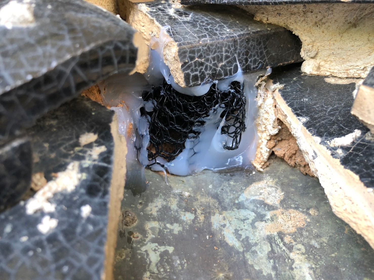 続いて、パンチングメタルや金網、コーキング剤などを用いて、あらゆる侵入経路を封鎖していきます。これによりイタチ、アライグマに限らず、他の害獣の再侵入も防ぐことができます。