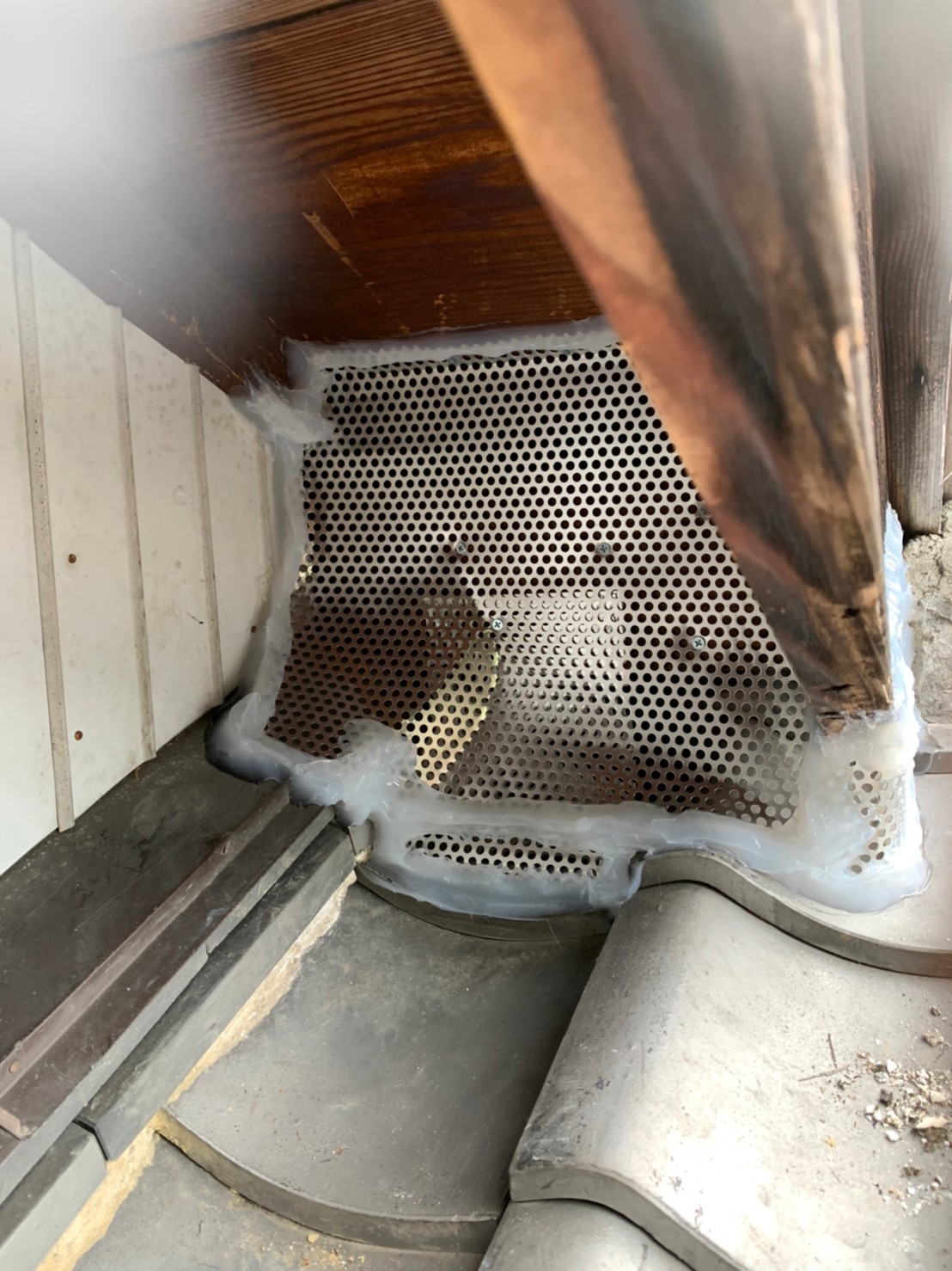 続いて、アライグマの再侵入を防ぐために、、パンチングメタルや金網、コーキング剤などを用いて侵入経路の封鎖を行います。