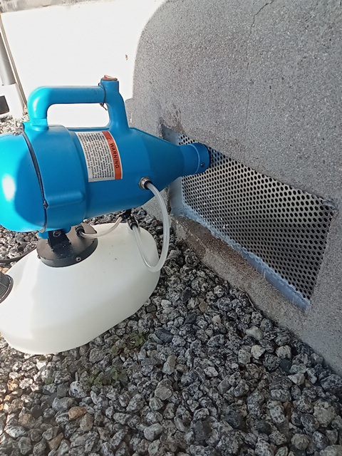 封鎖作業の後は、糞清掃や殺菌・消毒、マーキング消臭、ノミ・ダニ駆除、忌避剤散布・設置といった残りの行程を順序良く行い、終了です。