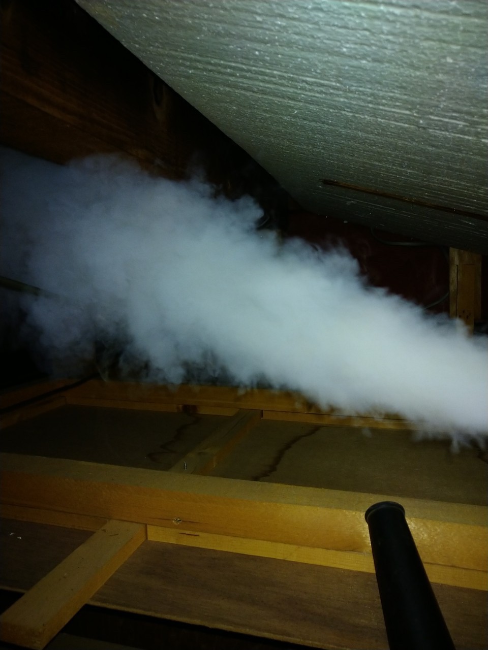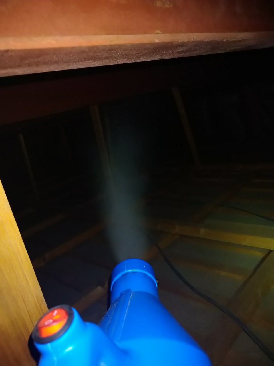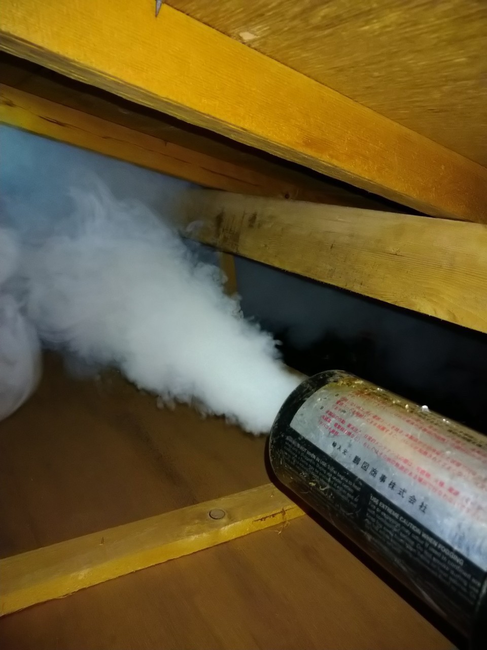 作業の初めに、ハクビシンの糞清掃や様々な作業を徹底して行えるように点検口を作成し、燻煙剤を使って屋内に潜んでいる個体を追い出します。
