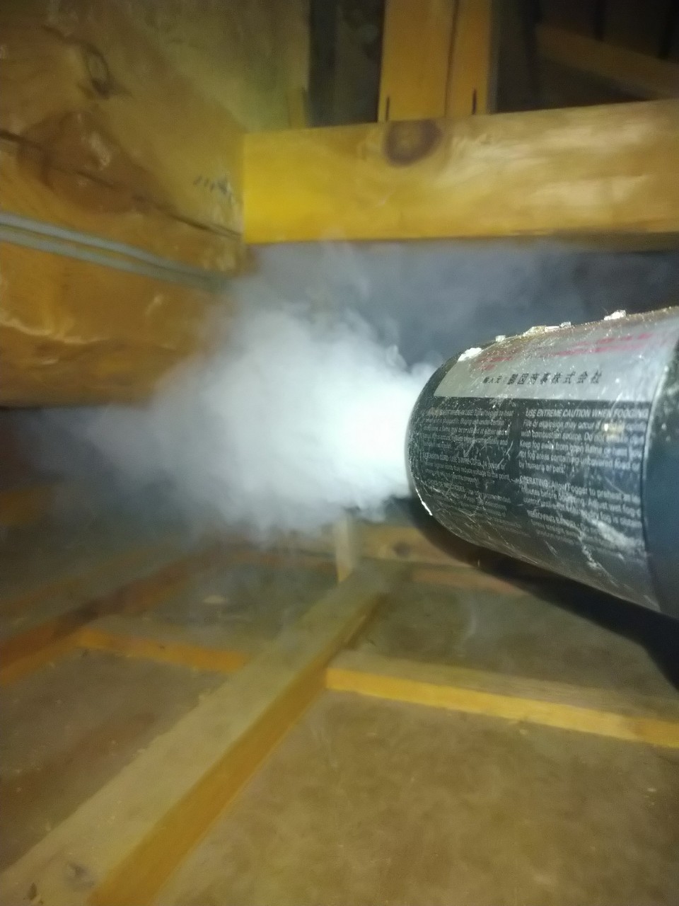 まずは、燻煙剤と呼ばれる薬剤を天井裏や床下に投入することで、アライグマを追い出していきます。