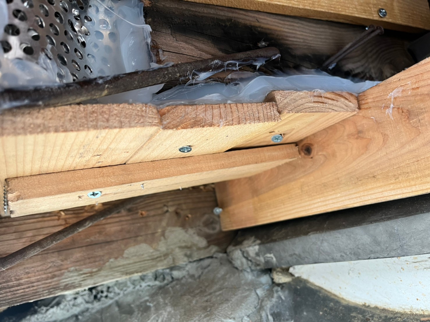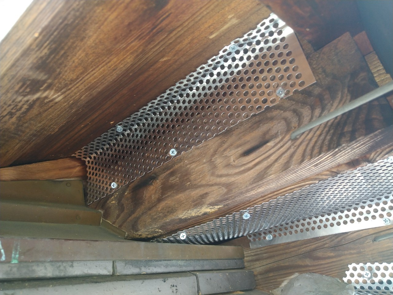 続いて、アライグマの再侵入を防ぐために、パンチングメタルや金網、コーキング剤などを用いて侵入経路の封鎖を行います。