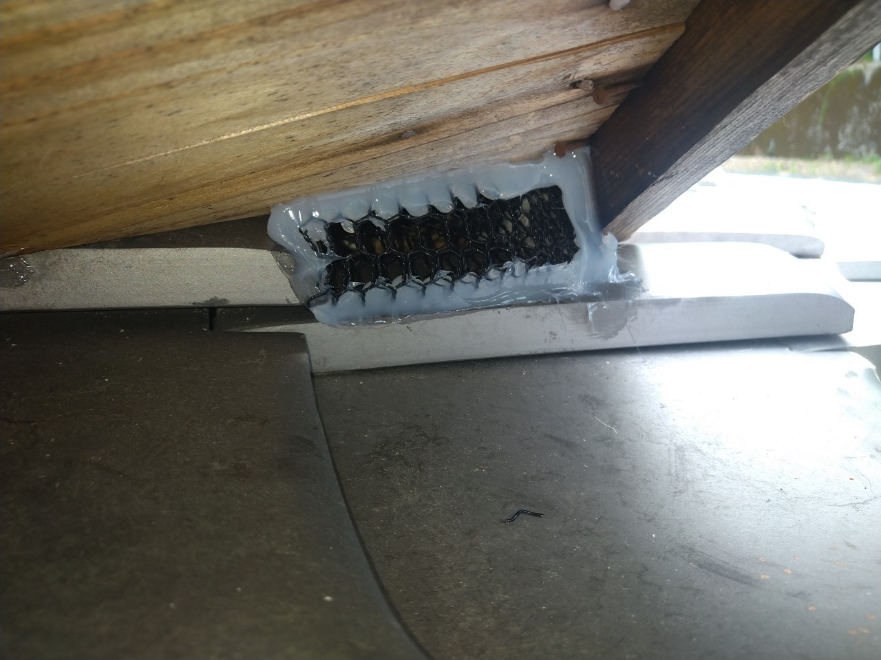 続いて、ネズミの再侵入を防ぐために、パンチングメタルや金網、コーキング剤などを用いて侵入経路の封鎖を行います。