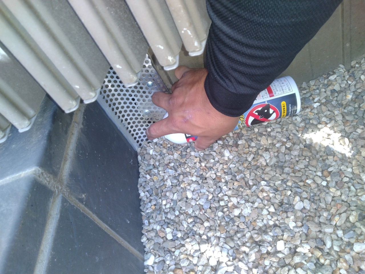 封鎖作業の後は、糞清掃や殺菌・消毒、マーキング消臭、ノミ・ダニ駆除といった残りの行程を順序良く行い、終了です。