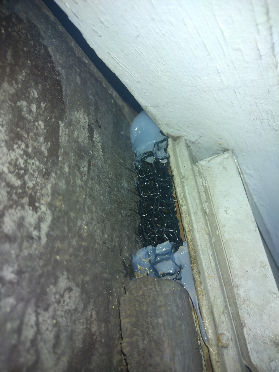 続いて、イタチの再侵入を防ぐために、パンチングメタルや金網、コーキング剤などを用いて侵入経路の封鎖を行います。